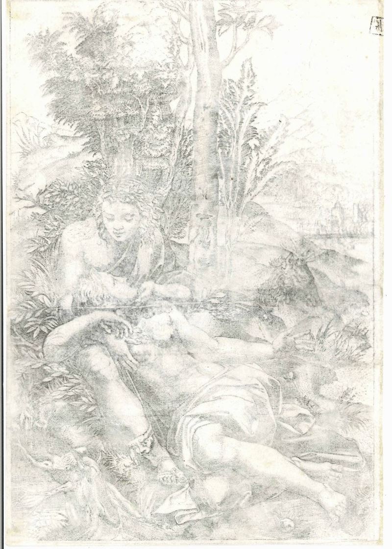 La prova, brillante e contrastata nel I stato di 2, prima del nome dello stampatore Salamanca, è impressa su carta avente filigrana Testa di Bue databile ai primi decenni del Cinquecento. Il raro capolavoro raimondesco, è tratto dall'affresco realizzato da Giulio Romano nel 1516 nella Stufetta del Cardinal Bibbiena. Al verso è leggibile il timbro di collezione di difficile lettura. Bibliografia: Bartsch, n. 484; Delaborde, n. 122; Passavant, n. 193; Raphael Invenit, p. 62; Giulio Romano pinxit, n. 33