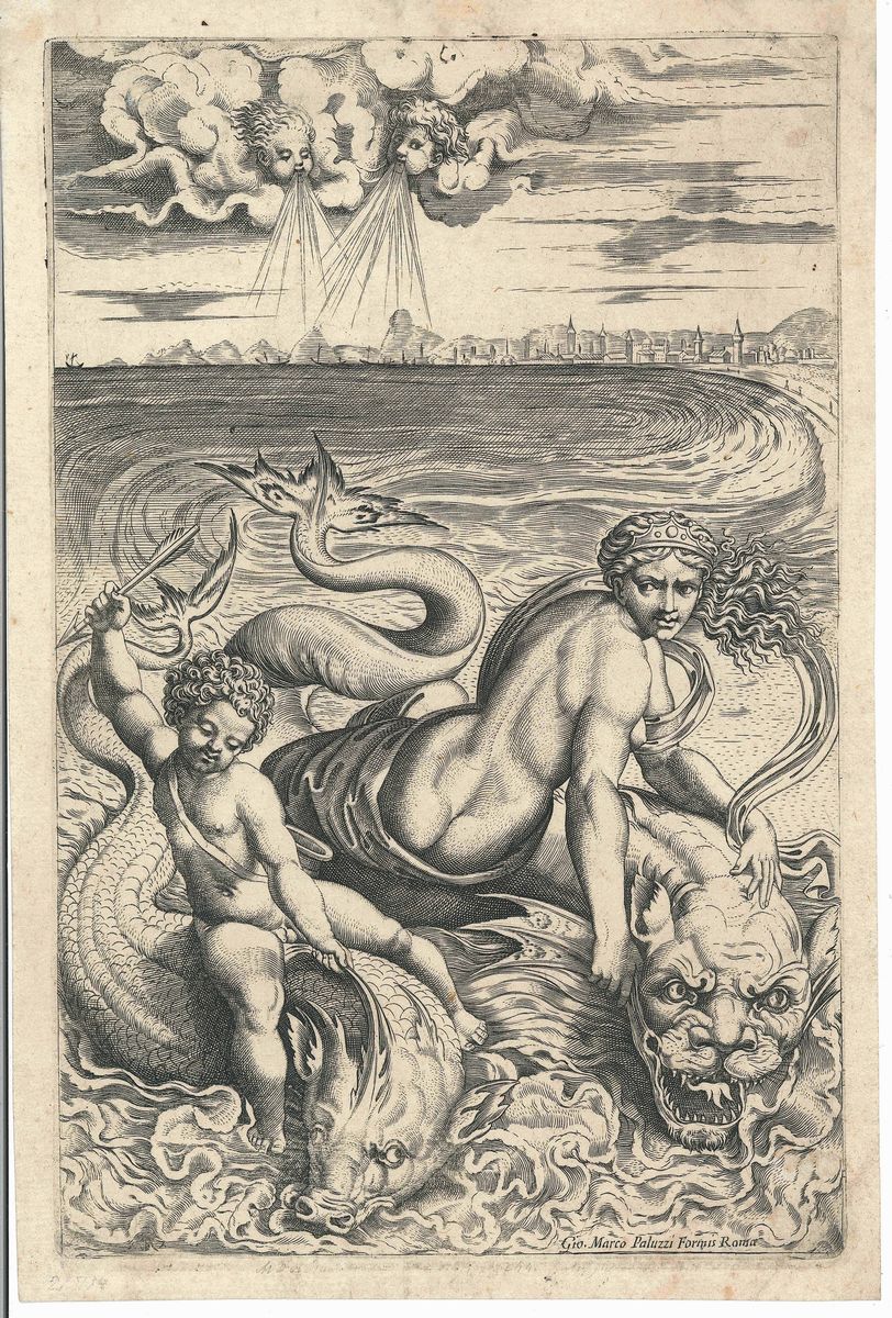 Marco Dente (Ravenna, 1493 - Roma, 1527) Venere e Amore portati da delfini