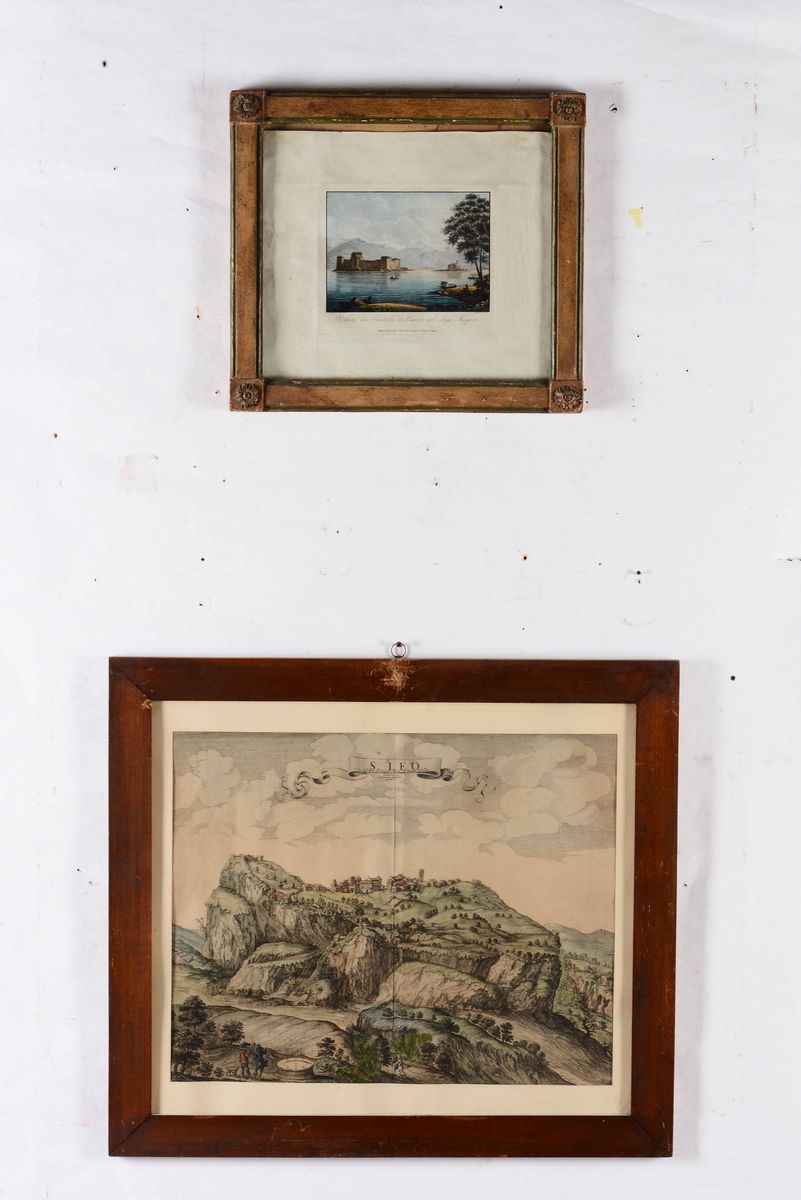 Cm 40 x 55 circa. Tre belle incisioni in coloritura. Entro cornici. (Si unisce nel lotto:) Altra piccola veduta a colori Castelli di Canero sul Lago Maggiore. Secolo XIX. Entro cornice.
