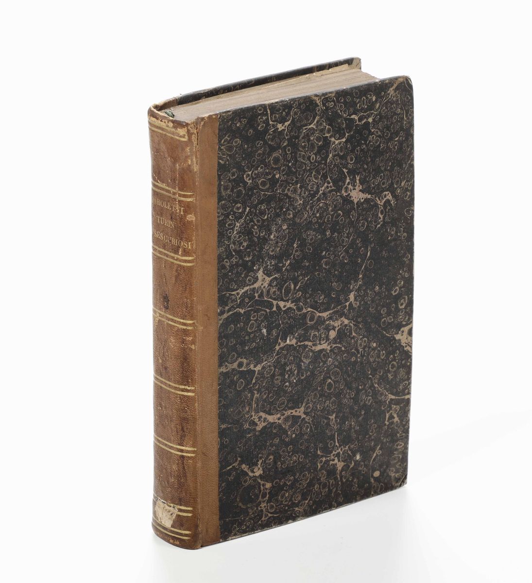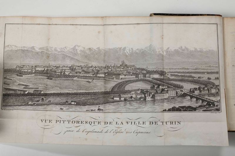 In-8°. Legatura coeva in mezza pelle. Bell'esemplare. Numerose tavole incise fuori testo tra cui una bella veduta di Torino in antiporta.