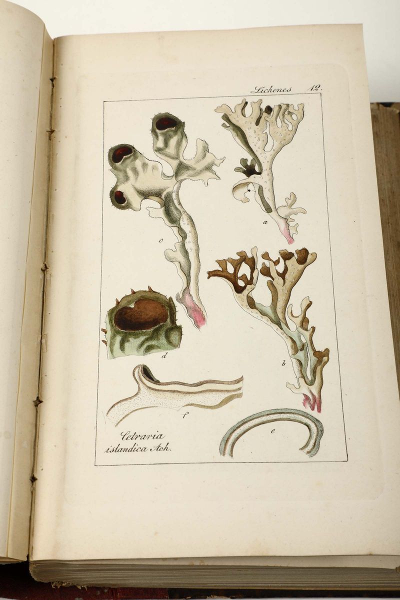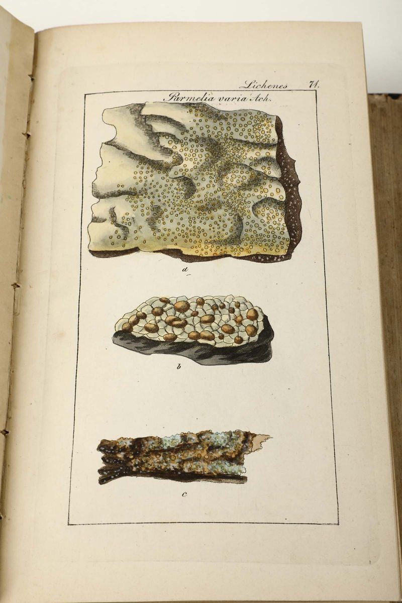 In-4°. Legatura coeva cartonata. Con sette tavole ripiegate in fine. Nel lotto si unisce: Dietrich, David, Deutschelands Kryptogamische Gewachsche, Jenz, 1846. Legatura in mezza tela del secolo XIX. Importante opera dedicata allo studio dei licheni con tavole incise e colorate.