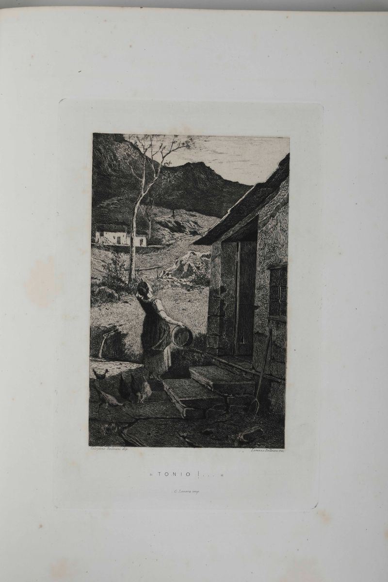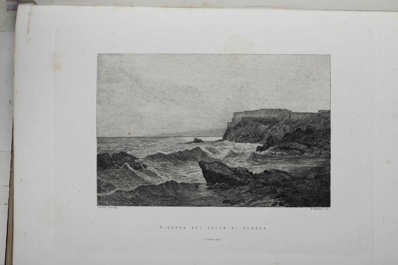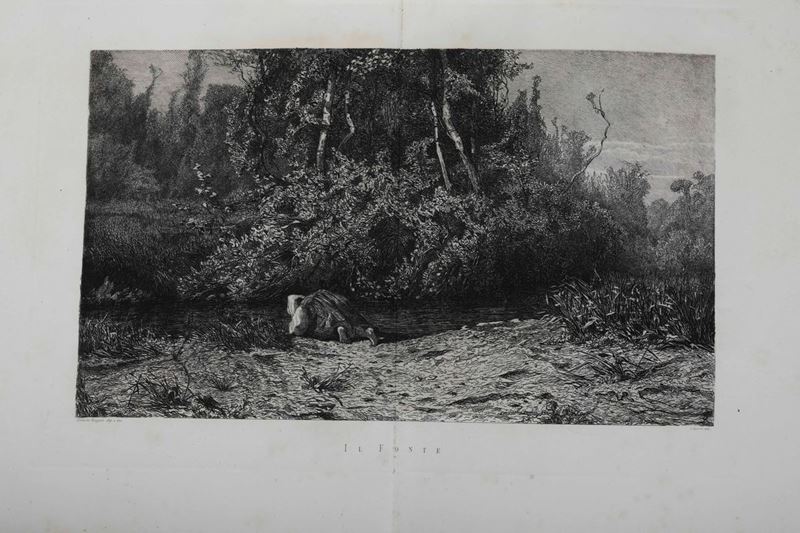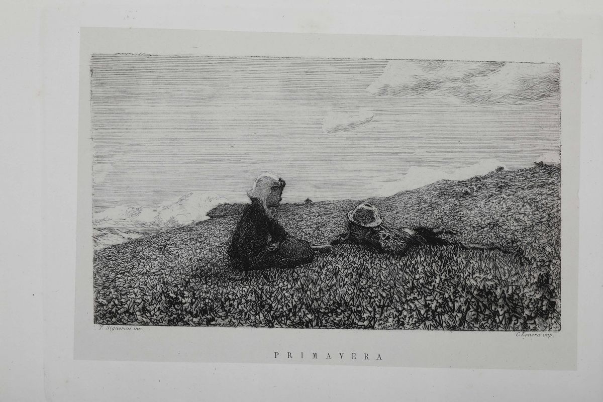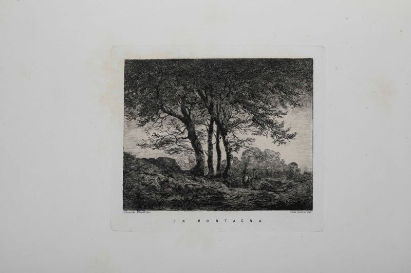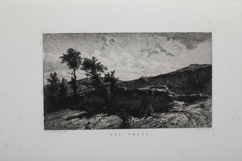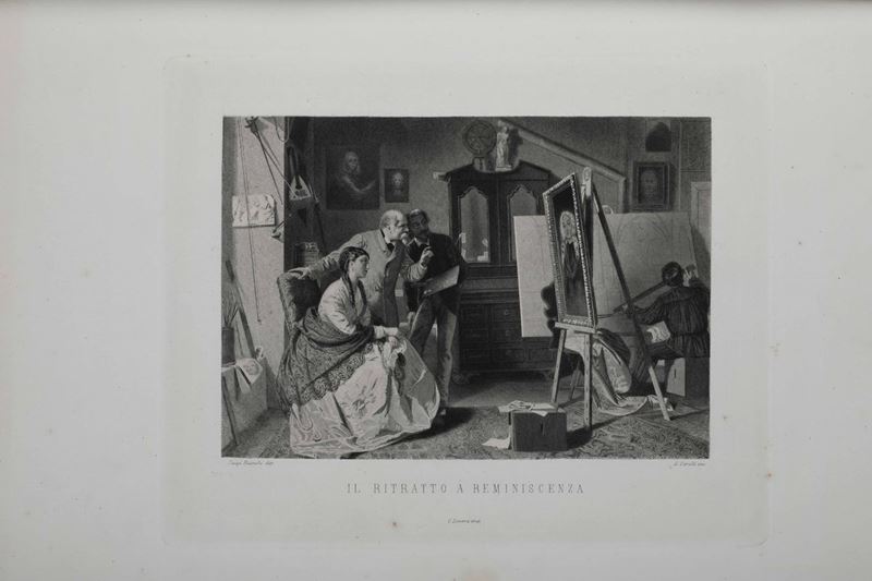 In-folio. Legatura coeva in tela percallina (Danni da umidità al piatto posteriore). Il solo volume quinto di questa celebre rivista che contiene tra le altre, due belle incisioni all'acquaforte di Ernesto Rayper (Settembre presso Rivara e Il Fonte) e una di Telemaco Signorini (Primavera).