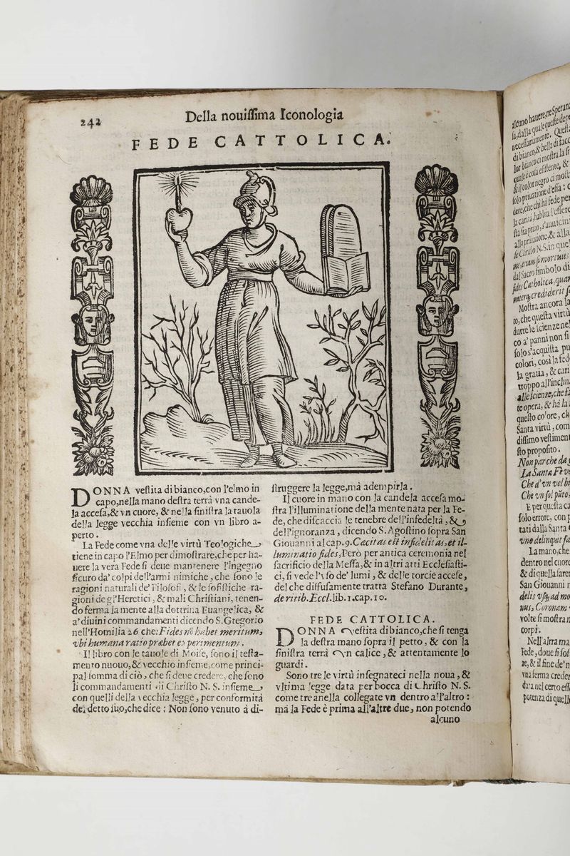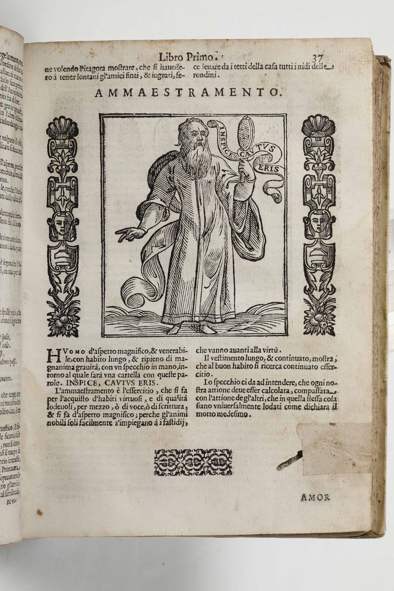 In-4°. Legatura coeva in pergamena rigida. Tre parti rilegate in un volume (mancanza del frontespizio alla terza parte). Centinaia di illustrazioni xilografiche nel testo. Opera fondamentale per lo studio e la comprensione dei motivi iconografici nella pittura antica.