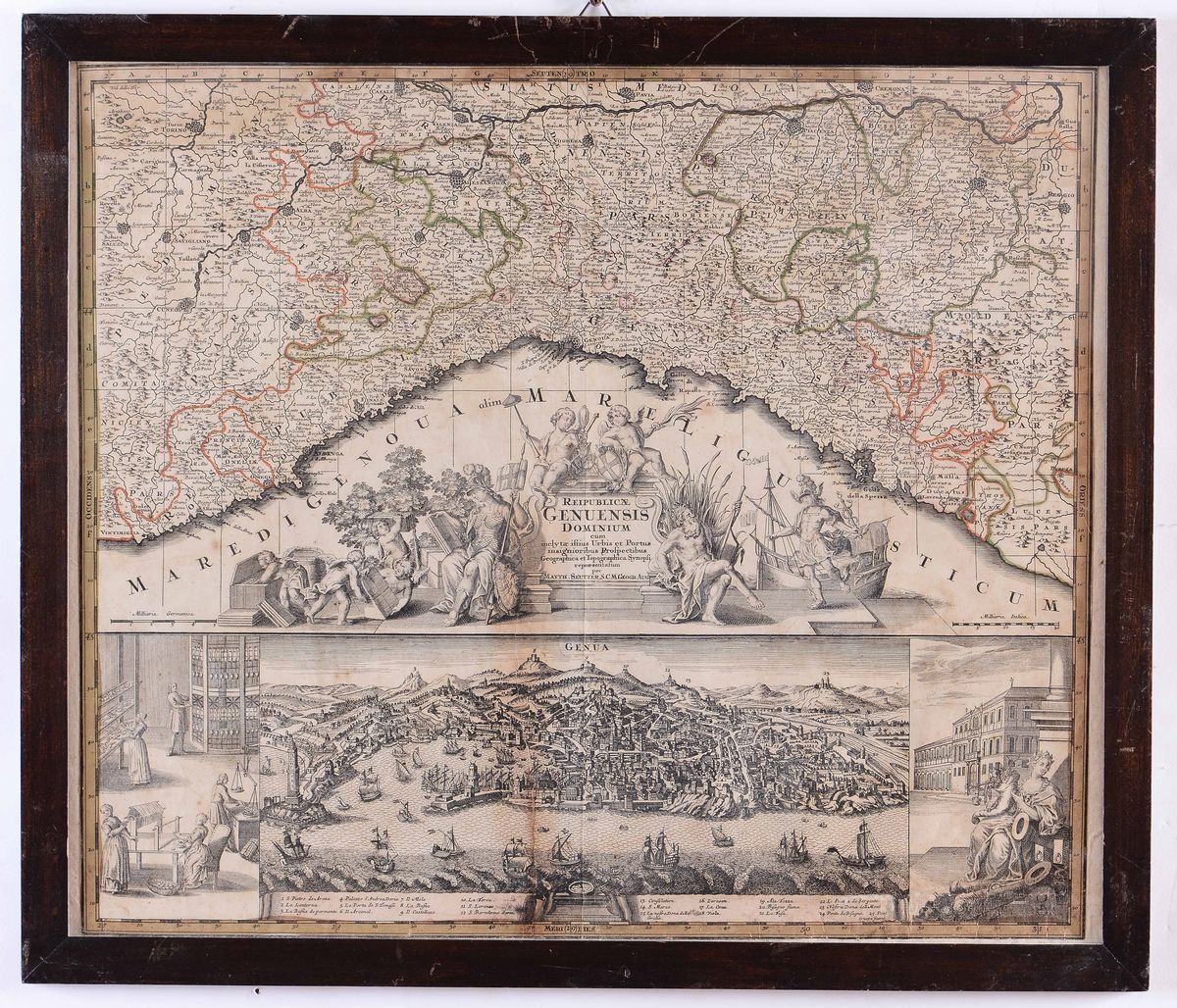 Cm. 50 x 58 cadauna. Due carte della Liguria con al piede, veduta della città di Genova. Confini in coloritura d'epoca. Entro cornici. Una delle due carte un poco brunita.