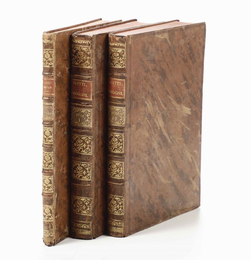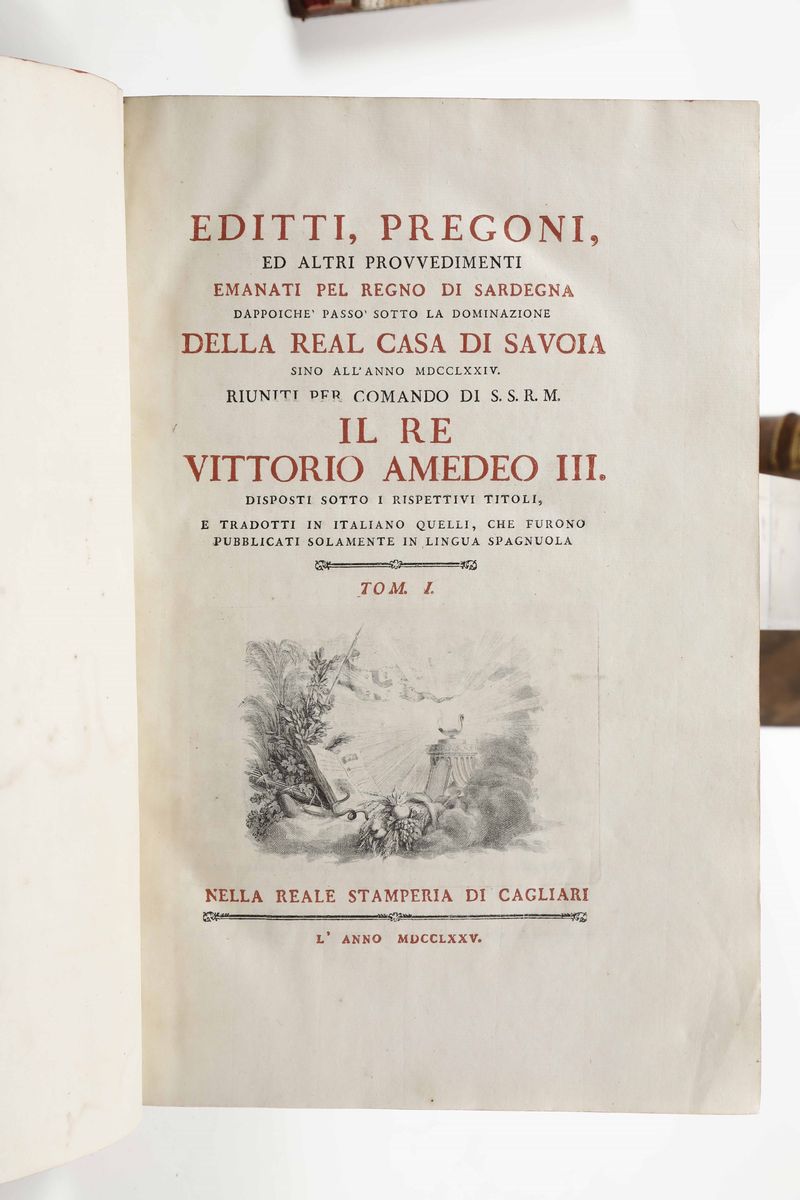 Editti, Pregoni, ed altri provvedimenti emanati pel regno di Sardegna dappoiché passo' sotto la dominazione della Real Casa di Savoia sino all'anno 1774..Cagliari, Nella Stamperia Reale di Cagliari,1775. Tomi I e II e indice delle materie.
