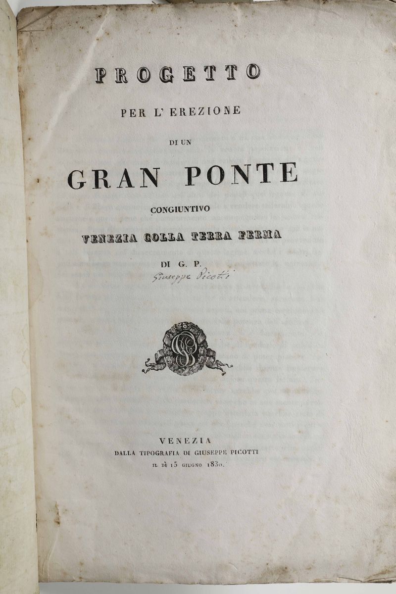Venezia - Ponte Progetto per l'erezione di un gran ponte congiuntivo Venezia colla terra ferma di G. P..Venezia, Picotti, [..]