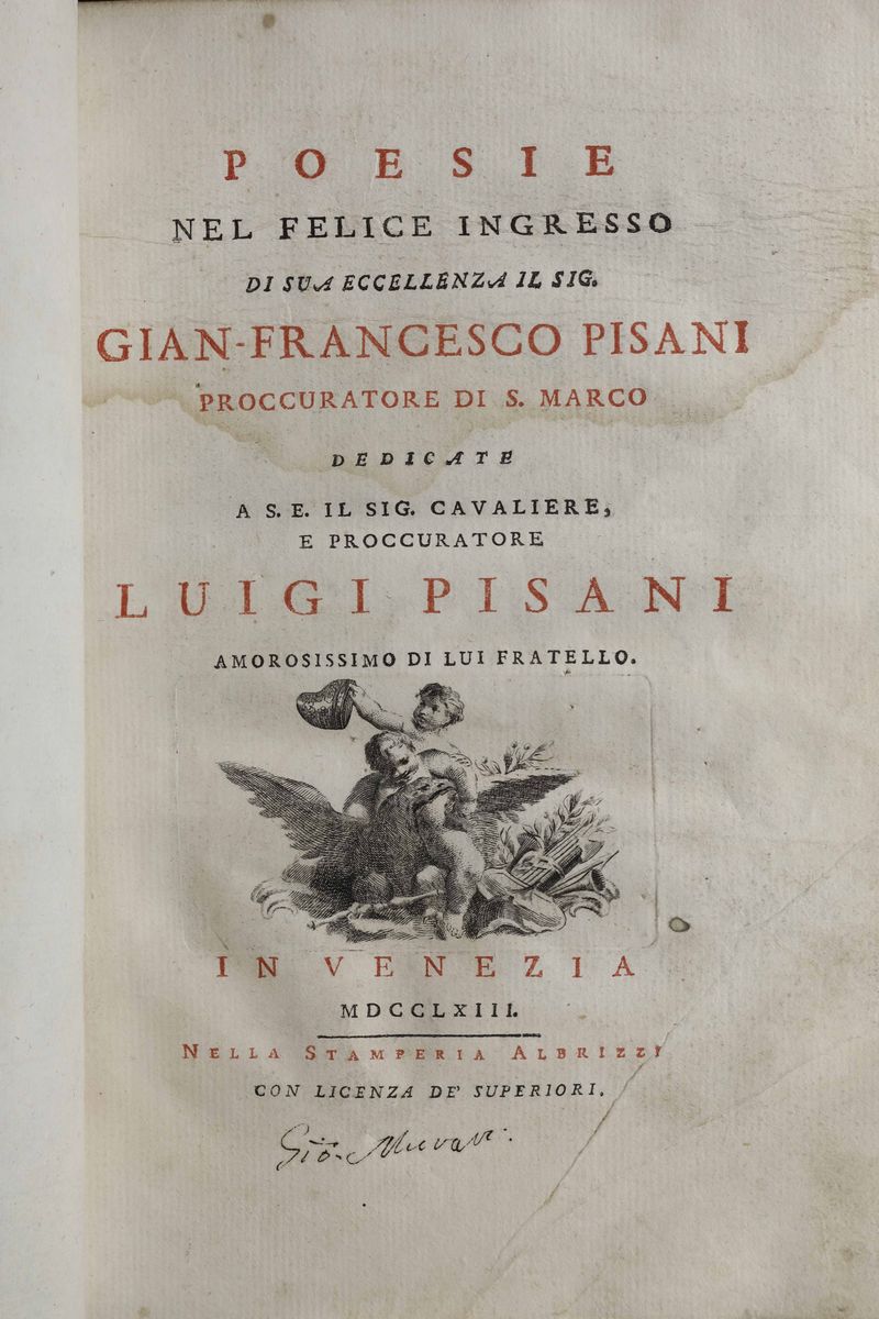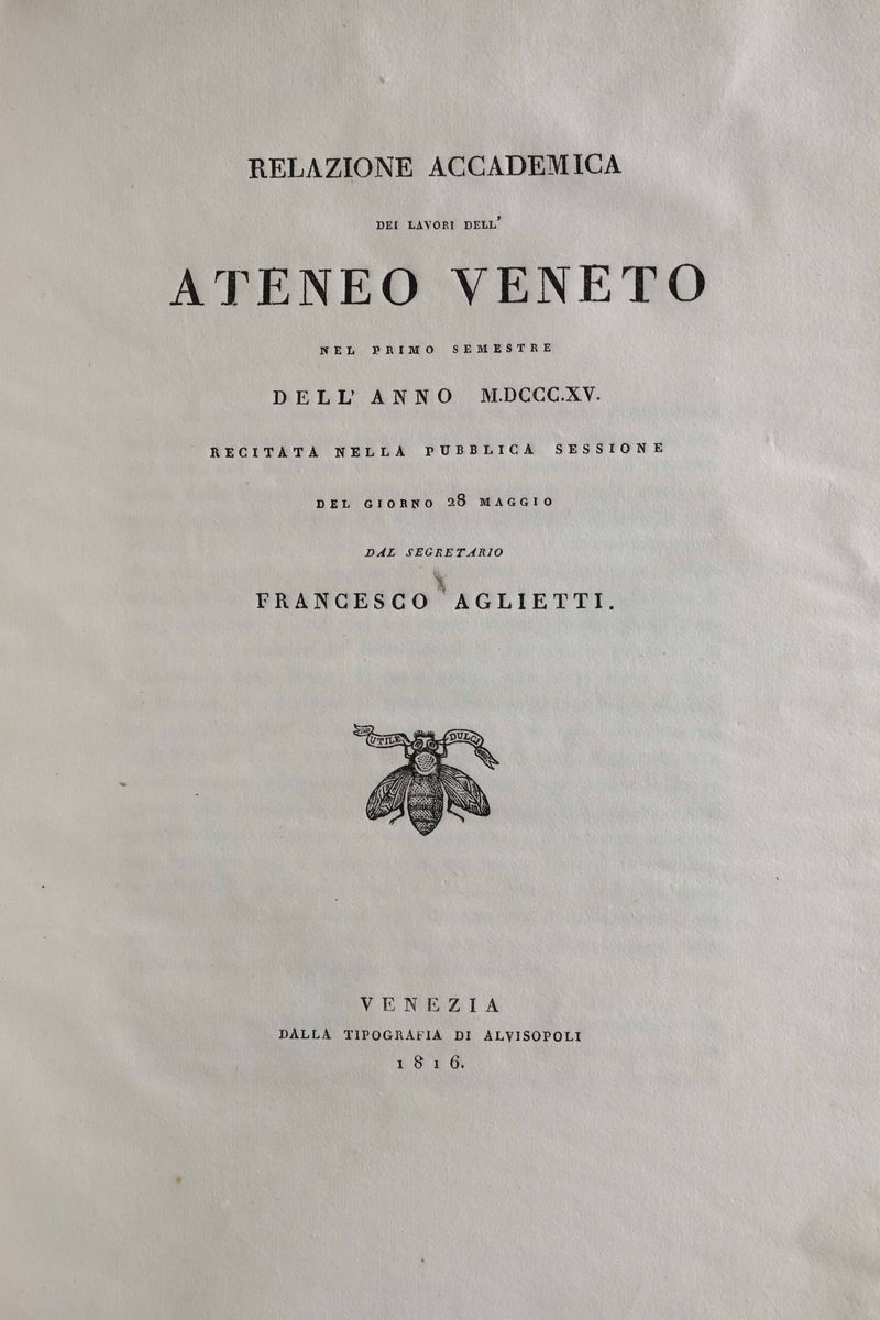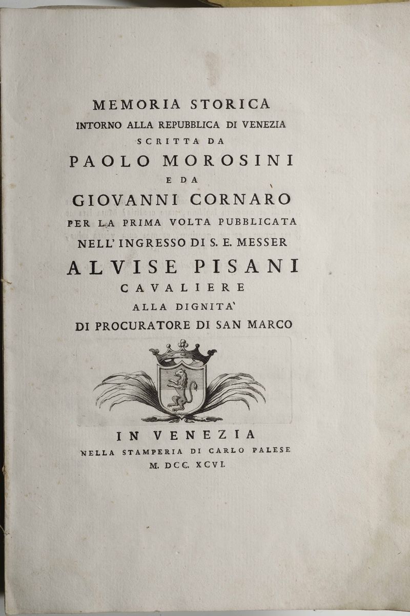 In-folio. Legatura in brossura muta coeva.Con una tavola incisa ripiegata in fine. (Insieme nel lotto:) Relazione accademica dei lavori dell'Ateneo Veneto..Venezia,Alvisopoli,1816./ Poesie del felice ingresso di sua eccellenza Gian-Francesco Pisani, Venezia, Albrizzi,1763. / Memoria storica intorno alla Repubblica di Venezia scritta da Paolo Morosini e da Giovanni Cornaro.. pubblicata nell'ingresso di Alvise Pisani In Venezia, Palese, 1796.(Rotture ai piatti).