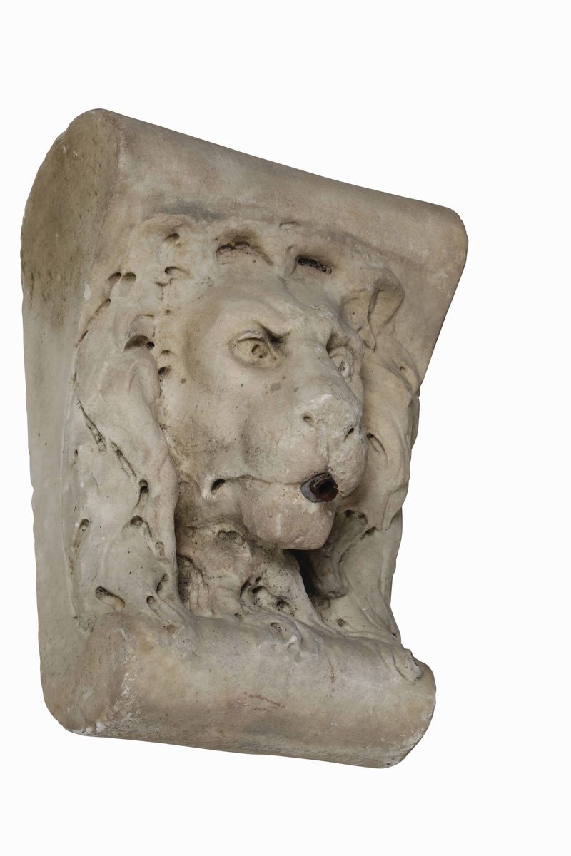 Coppia di mascheroni raffiguranti teste leonine. Marmo bianco. Scultore barocco italiano del XVIII secolo