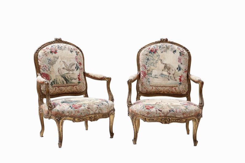 Salotto in legno intagliato e dorato composto da quattro poltrone e divano in legno intagliato e dorato, Francia, XIX sec [..]