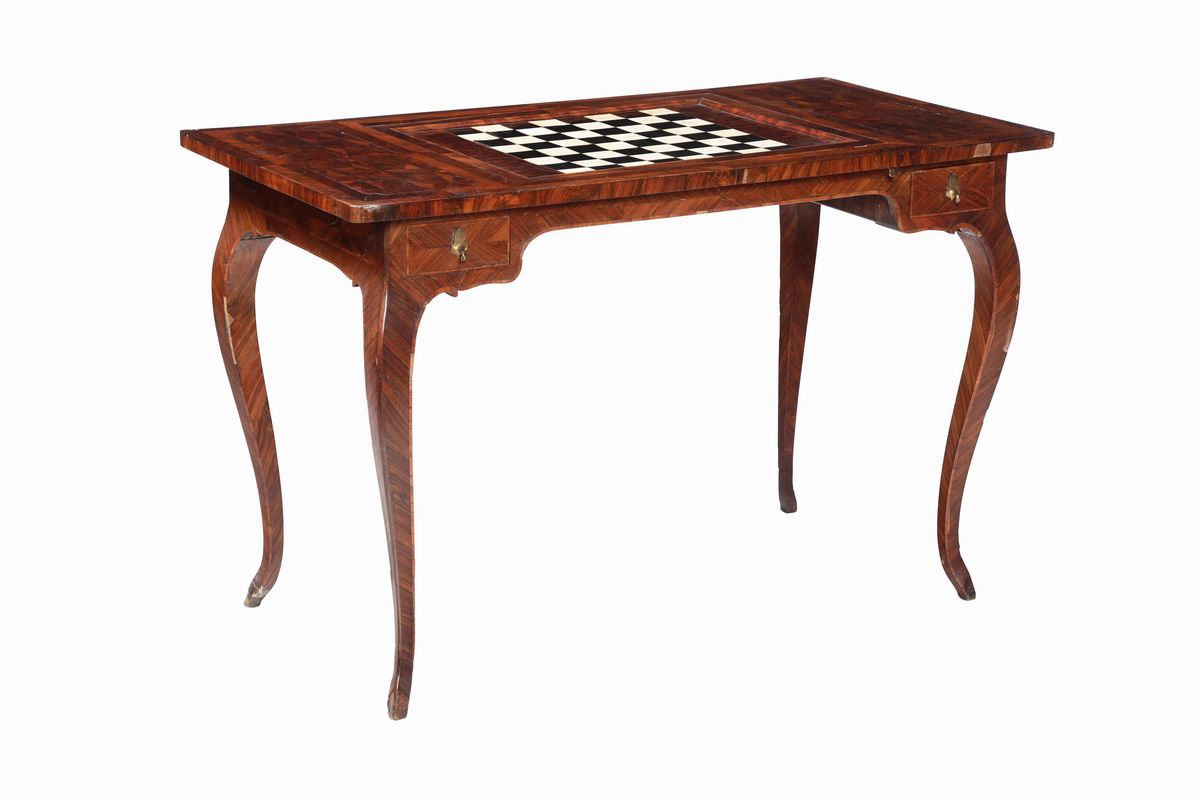 Tavolo da gioco Luigi XV interamente lastronato in palissandro e bois de rose, ebanisteria dell'Italia centrale XVIII sec [..]