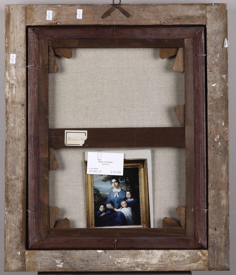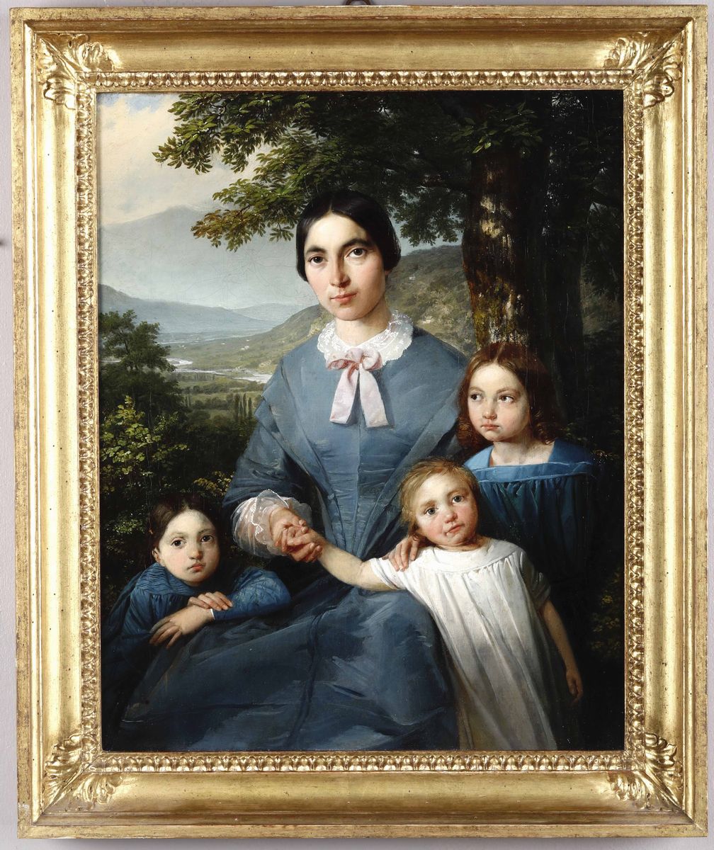 Artista del XIX secolo Ritratto di madre con tre bambini e paesaggio sullo sfondo