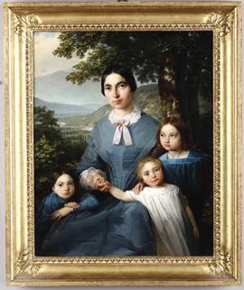 Ritratto di madre con tre bambini e paesaggio sullo sfondo