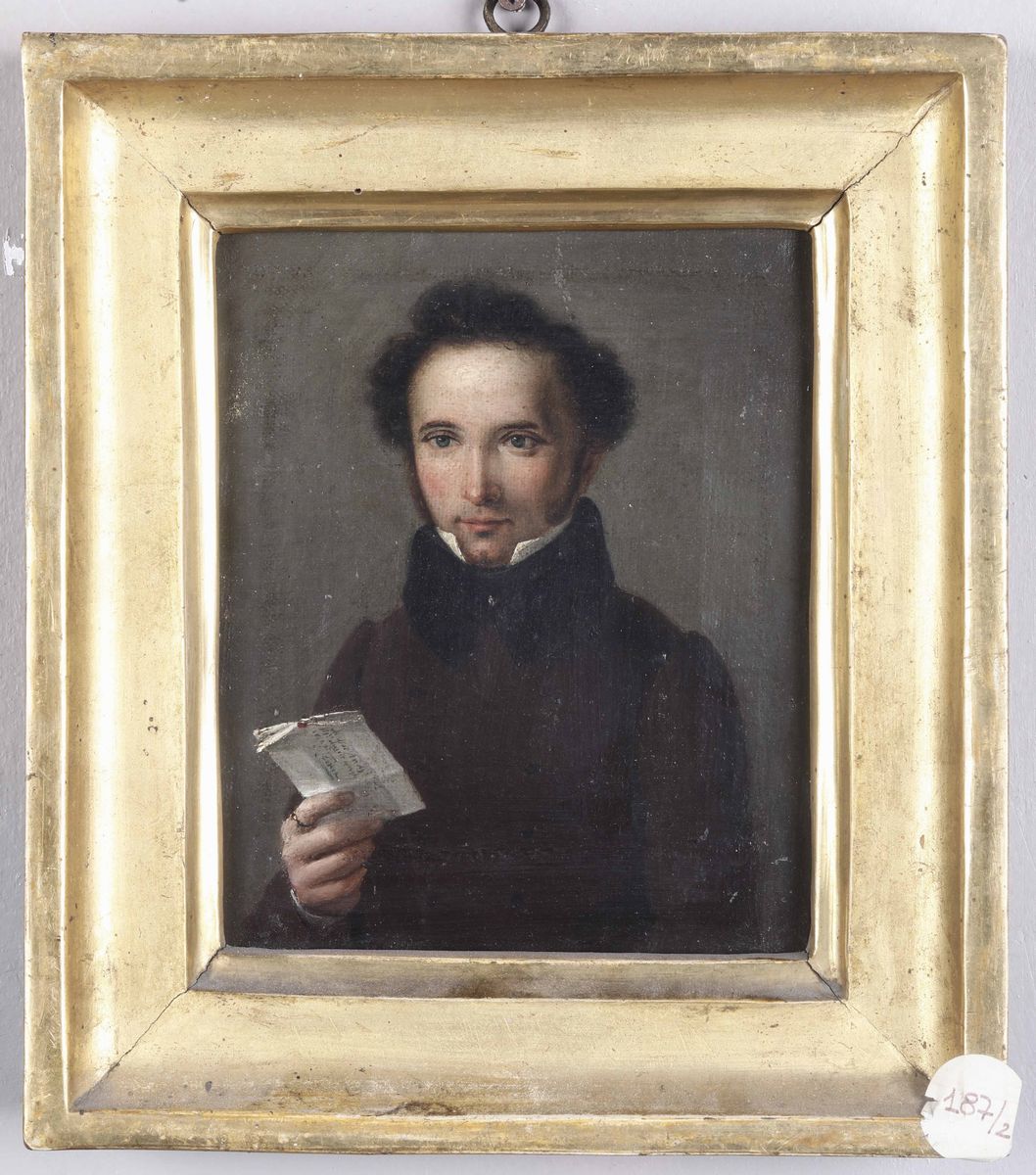 Artista del XIX secolo Giovane gentiluomo in giubba marrone e colletto nero con in mano uno scritto