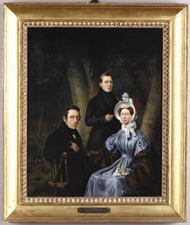 Gruppo di famiglia con tre persone in un giardino, 1836