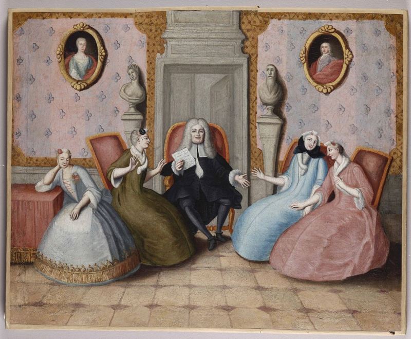 Scuola del XVIII secolo Interno con quattro signore e un gentiluomo seduti