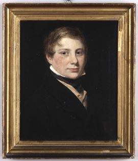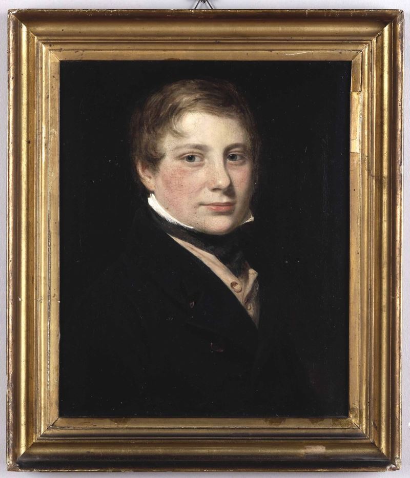 Scuola inglese, seconda metà del XIX secolo Ritratto di giovane biondo in giacca nera e panciotto rosa