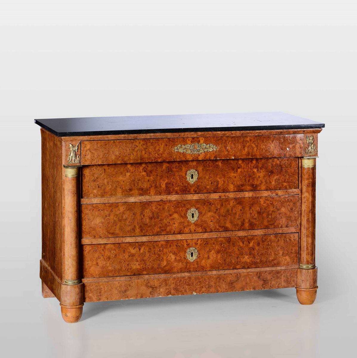 Cassettone in radica di olmo con applicazioni in metallo dorato. Francia periodo della Restaurazione, prima metà XIX secolo