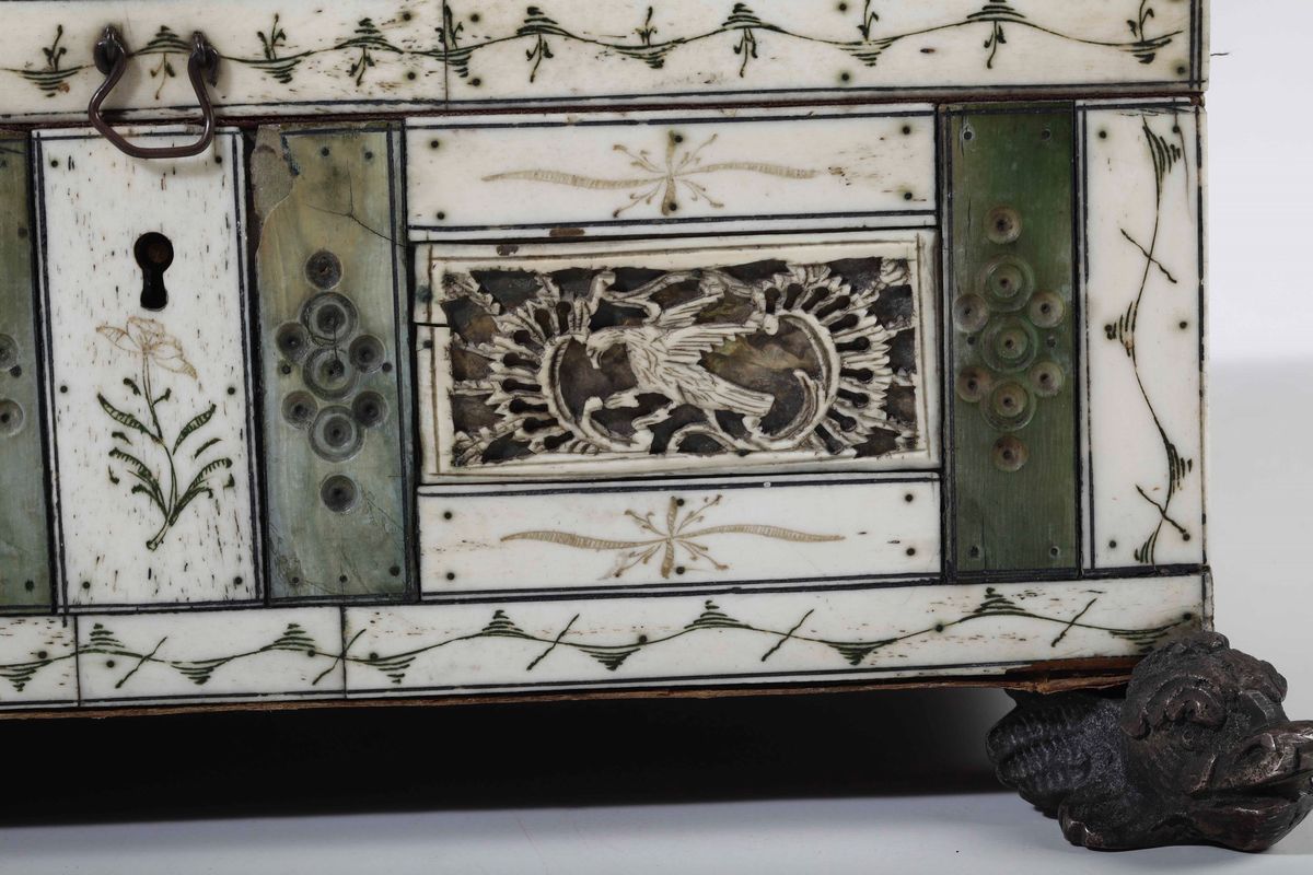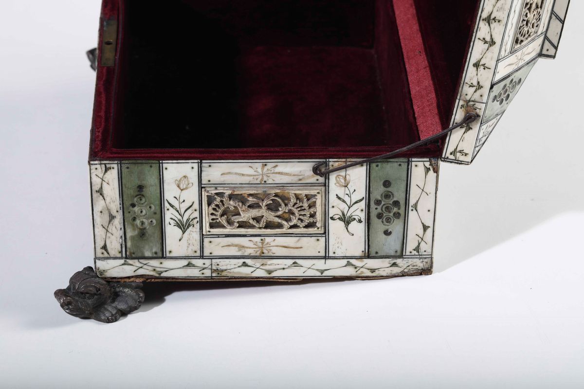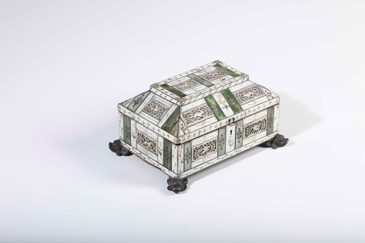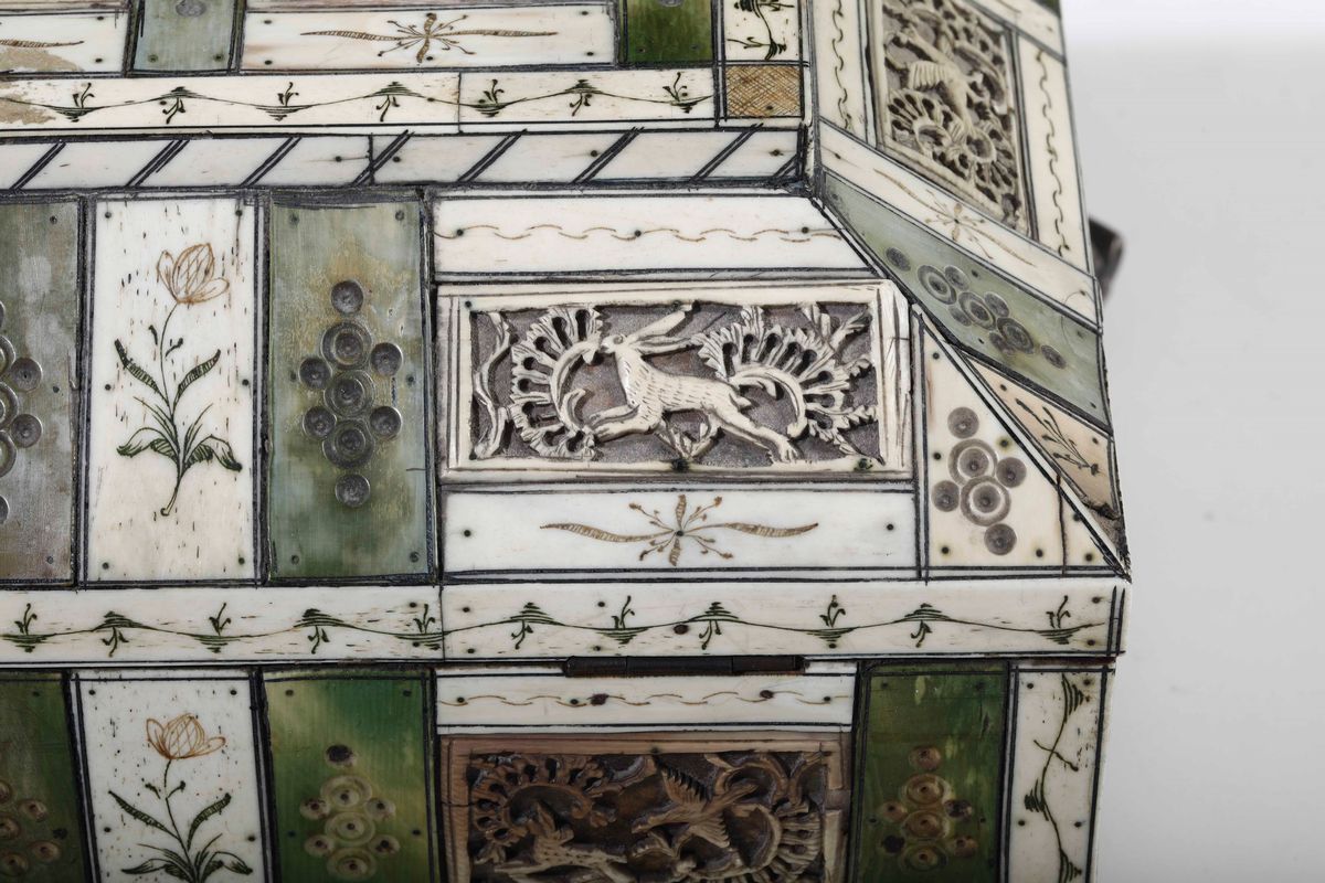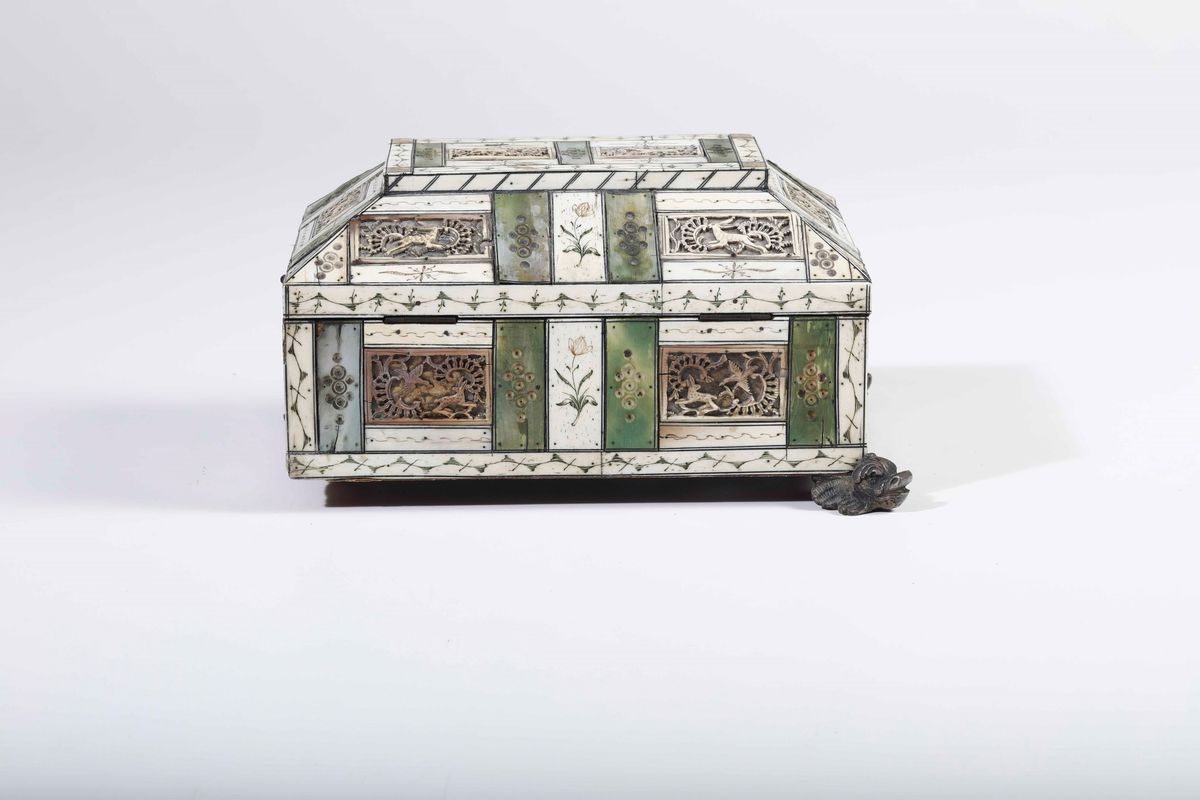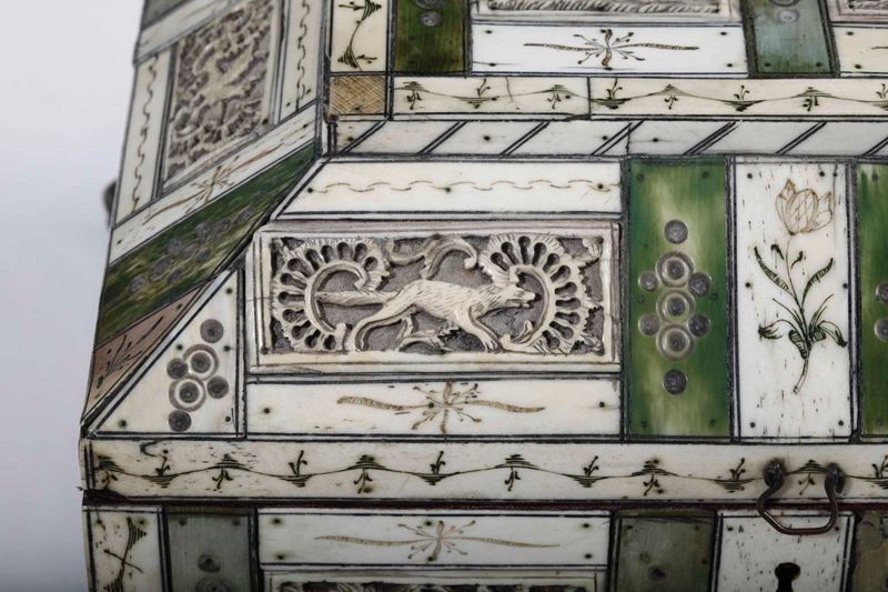 Cofanetto in avorio intagliato, traforato e tinto verde. Russia, Kholmogory (?) XVIII secolo