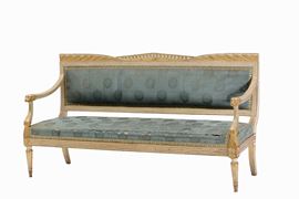 braccioli scanalati terminanti con testa leonina, seduta e schienale imbottiti, gambe anteriori troncoconiche scanalate e posteriori arcuate, cm 174x56x93