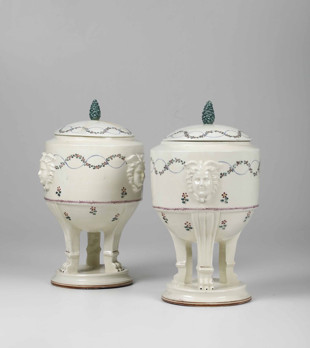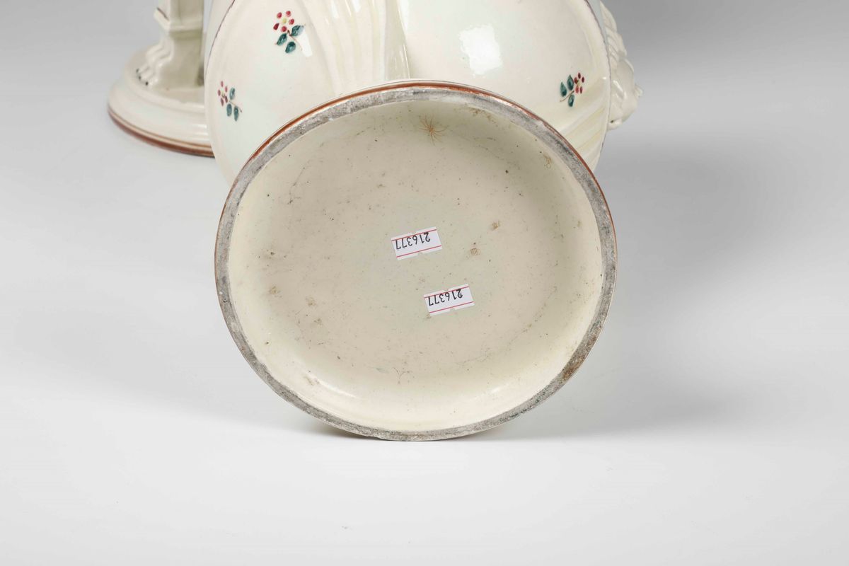 Terraglia. Marca: “Italy DV” in nero. Altezza cm 40,5. Conservazione: un coperchio rotto in tre pezzi e ricomposto; piccole sbeccature ai nasi dei mascheroni