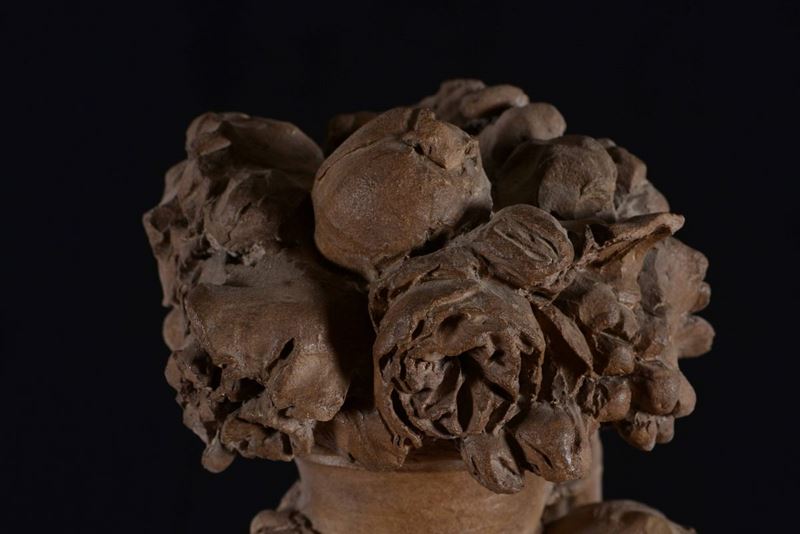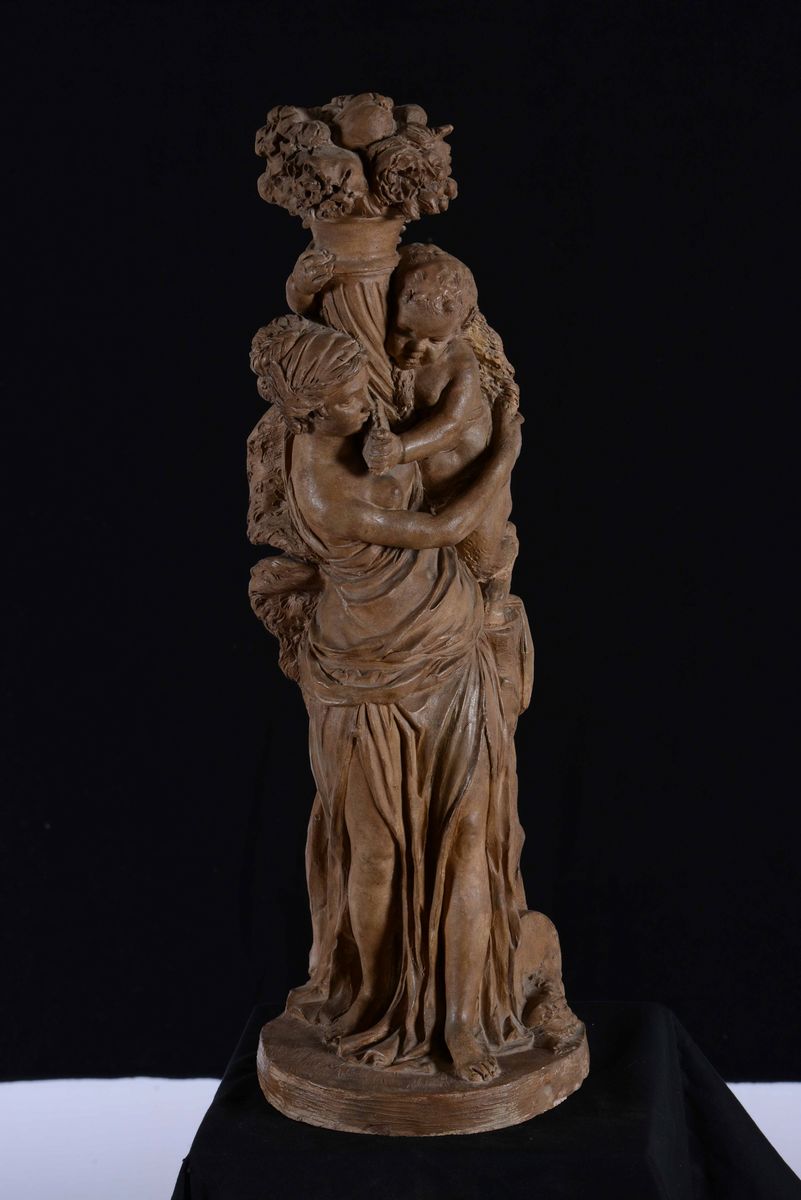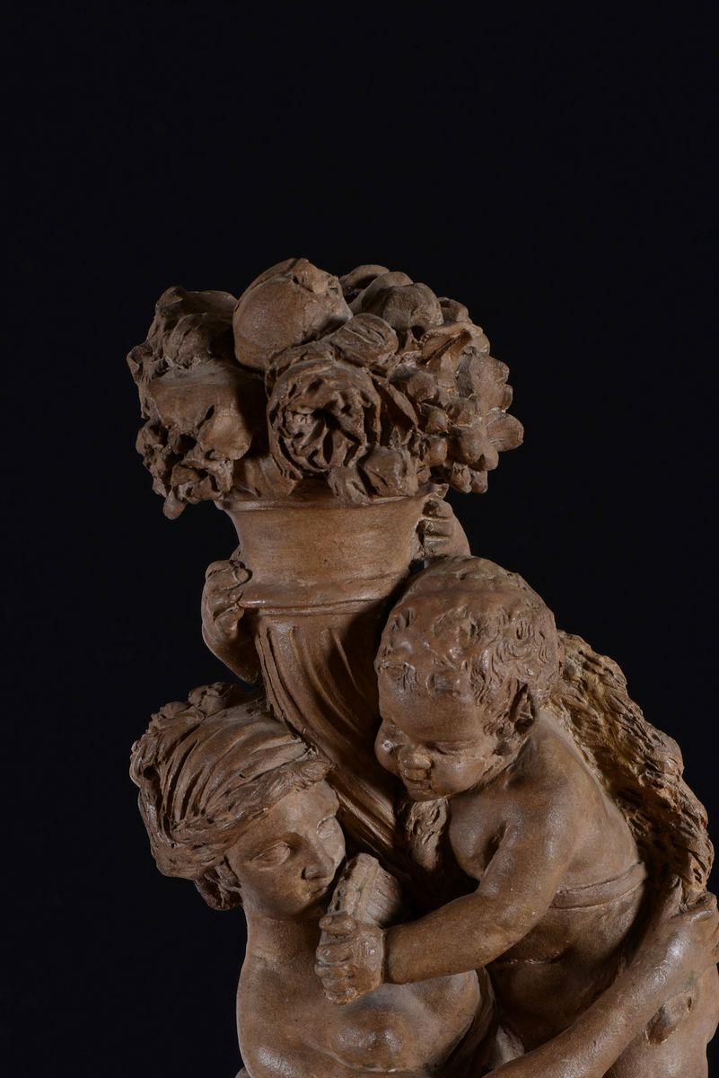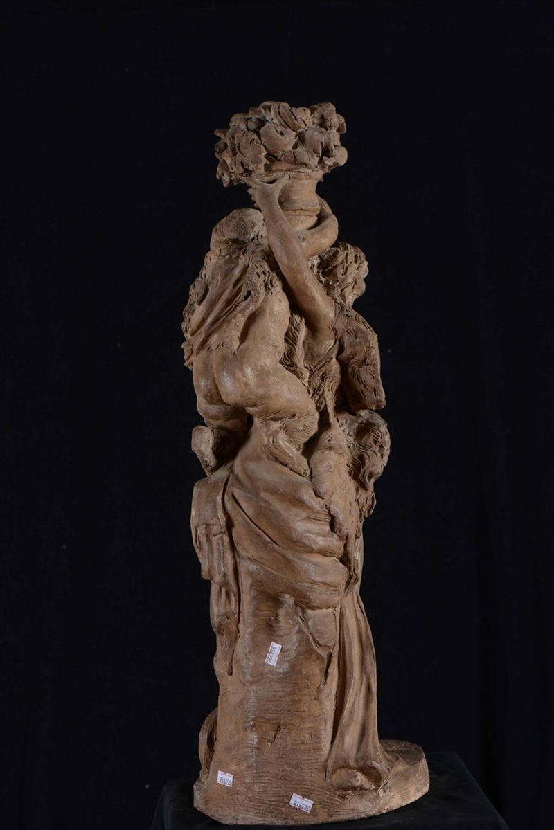 Gruppo allegorico in terracotta raffigurante baccante che sorregge giovane satiro nell'atto di tenere una cornucopia. Francia [..]