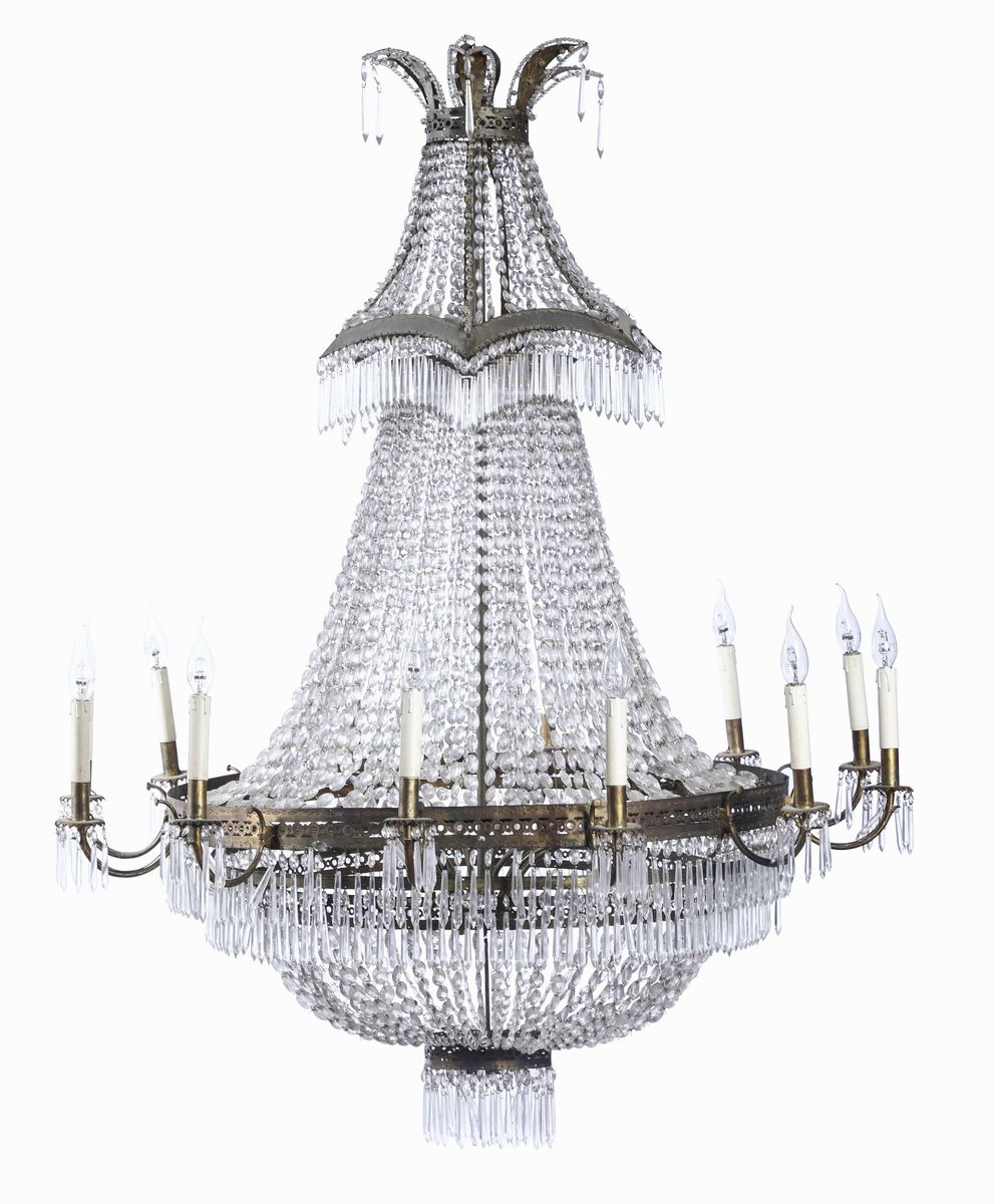 Lampadario a mongolfiera in metallo e cristalli, XIX secolo