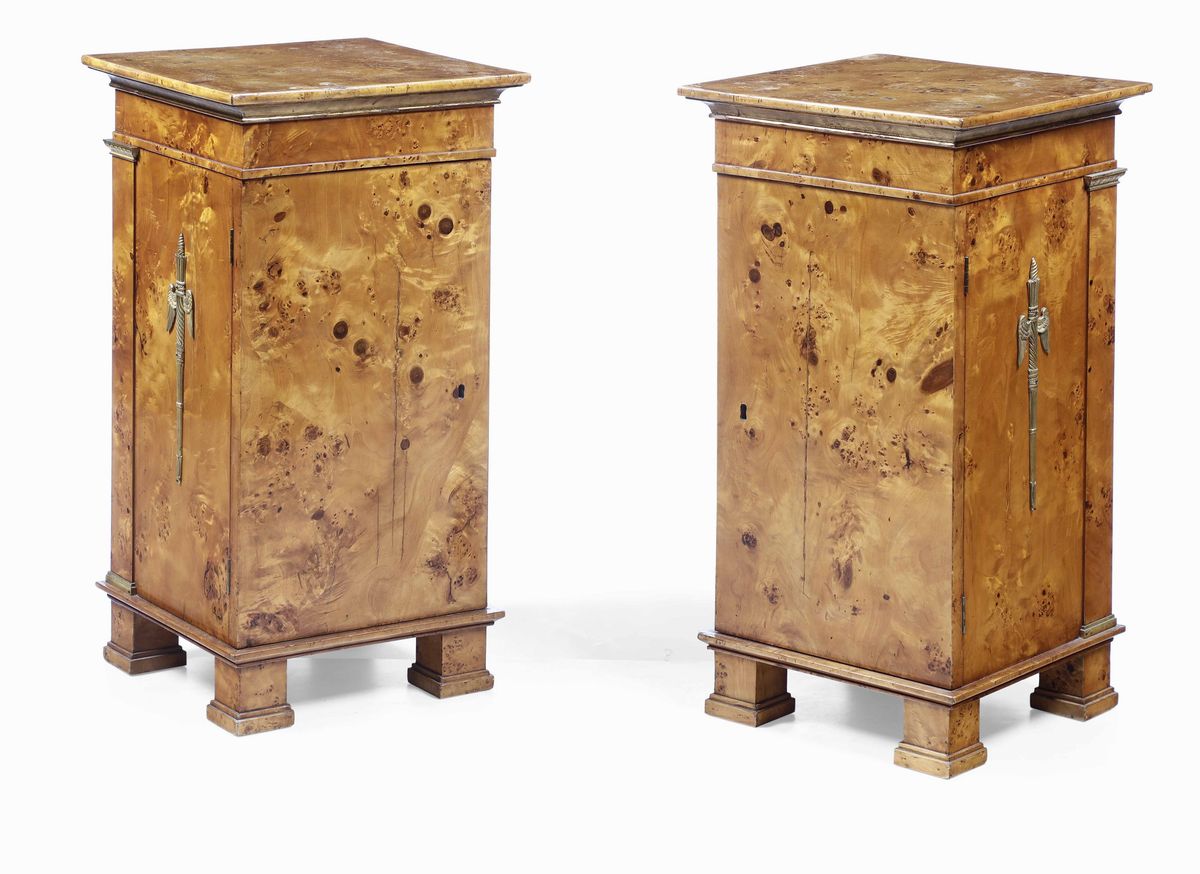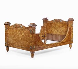 Letto e coppia di comodini in radica di olmo con applicazioni in metallo dorato. Francia periodo della Restaurazione, prima metà XIX secolo