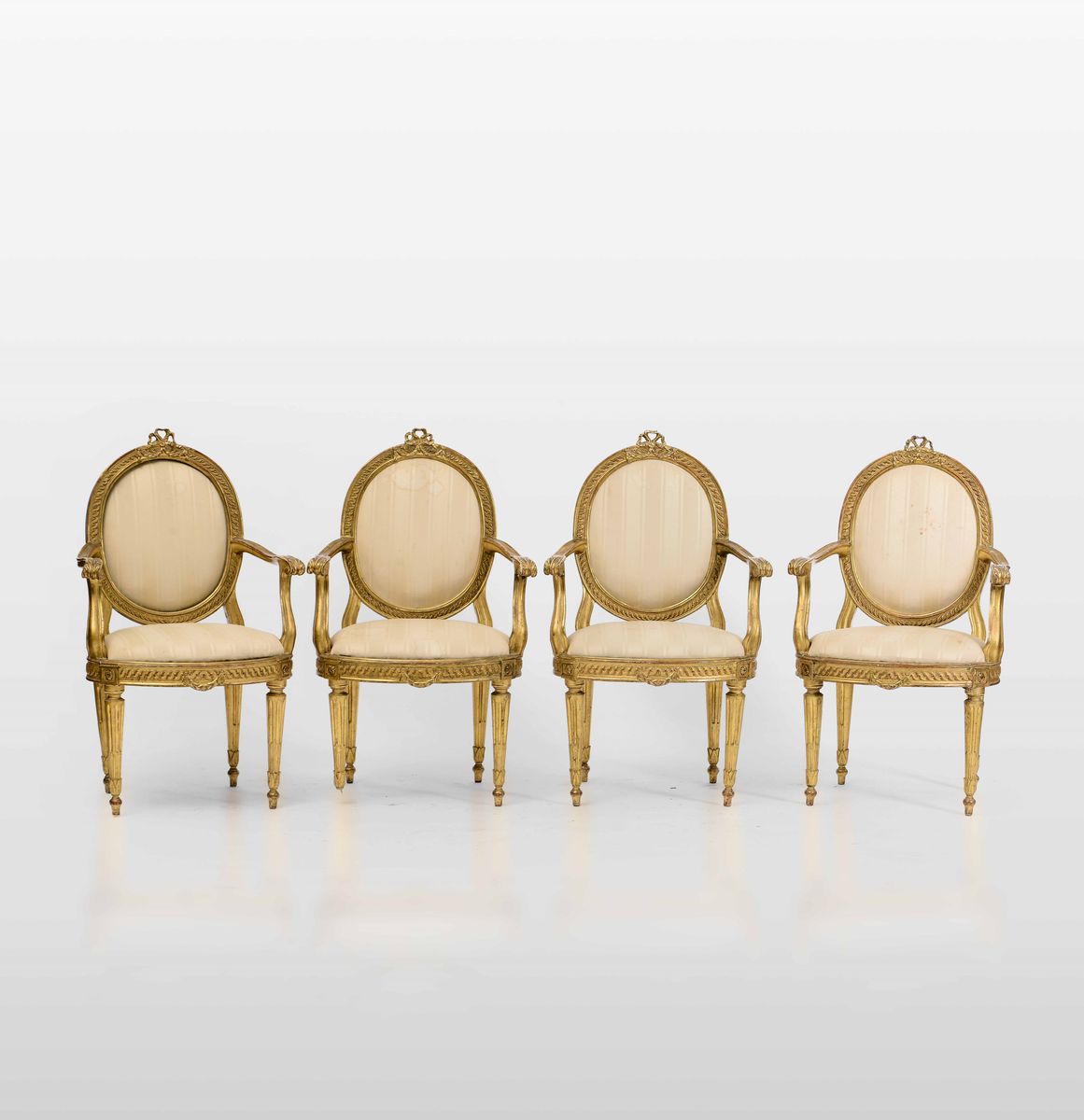 Serie di quattro poltrone in legno intagliato e dorato. Roma (?) seconda metà XVIII secolo