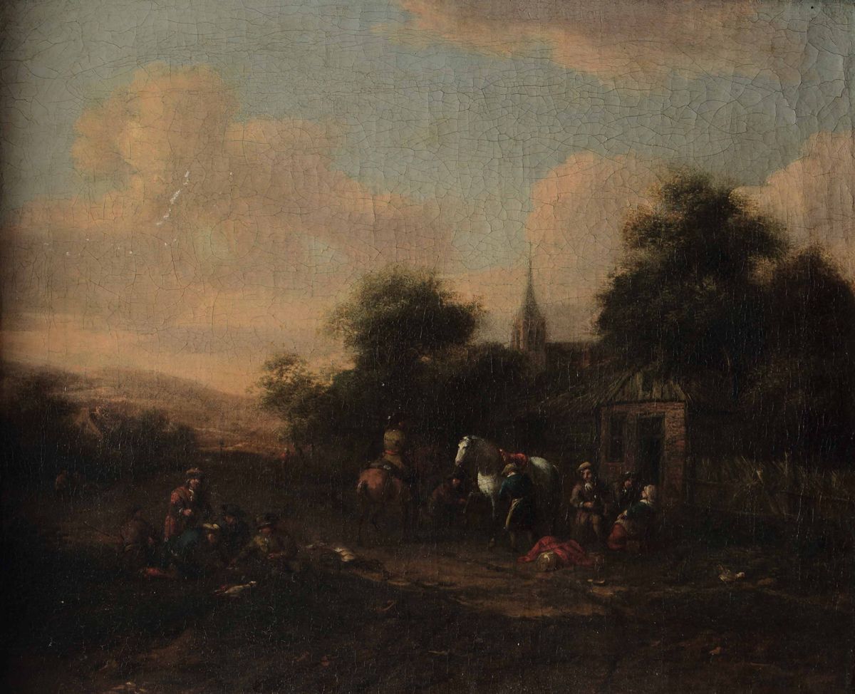 Scuola fiamminga del XVIII secolo Paesaggio con cavalieri