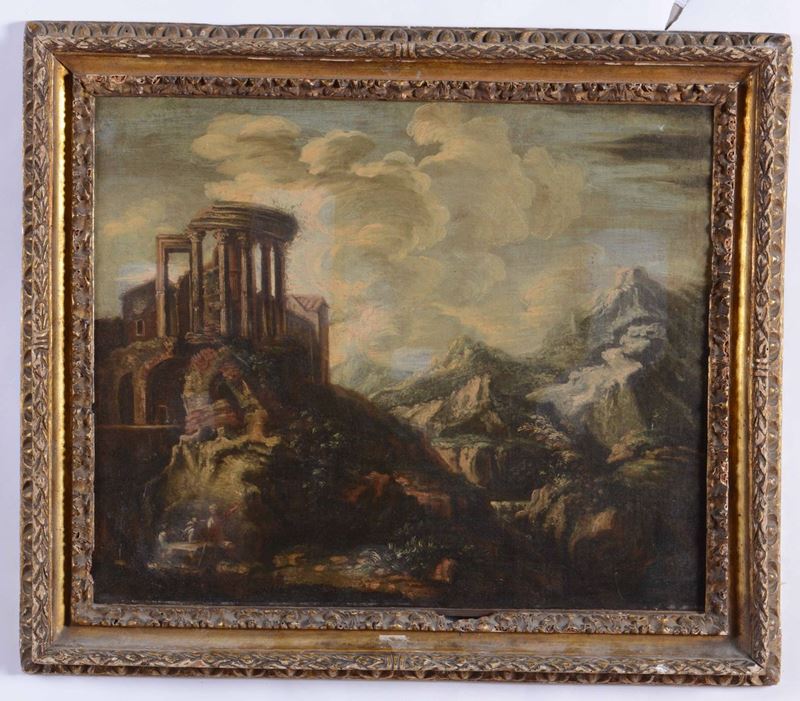 Scuola romana del XVIII secolo Paesaggio con rovine e figure