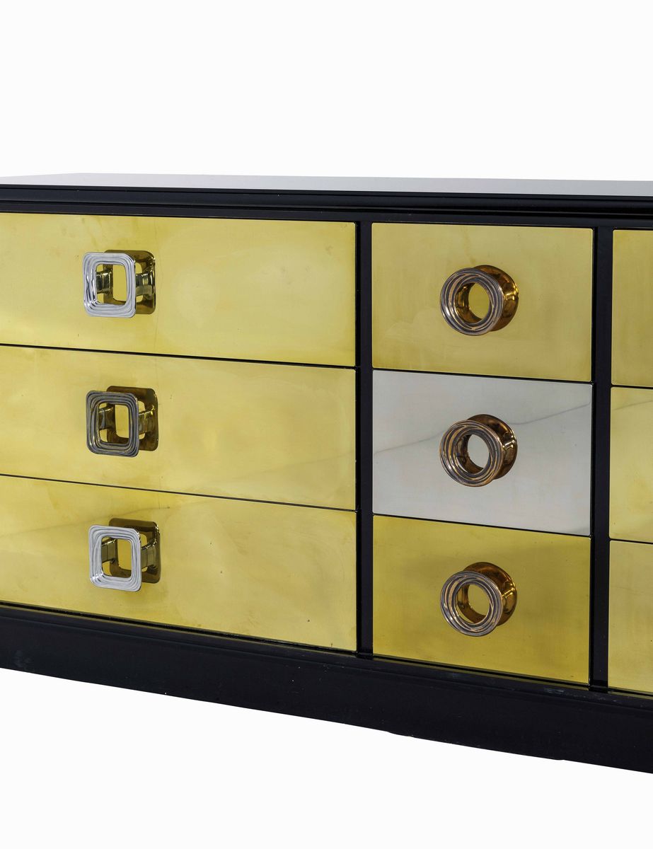 Cassettiera con struttura in legno, piano in vetro e rivestimenti in ottone e acciaio.