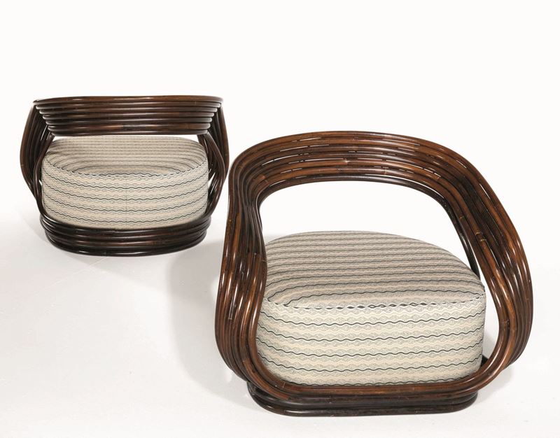 Coppia di poltrone mod Eva. con struttura in canna d'India e sedute con rivestimenti in tessuto.