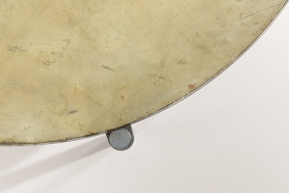 Tavolo basso con sostegni in metallo tubolare, piano in legno rivestito in pergamena e cristallo molato.