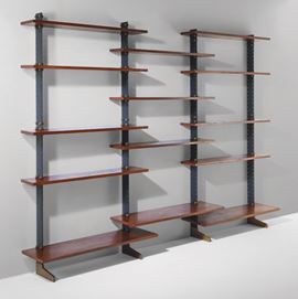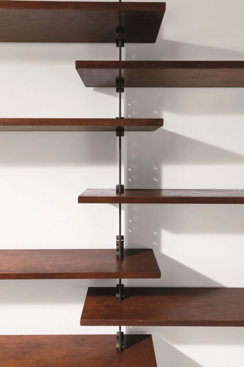 Libreria LIB2 con montanti in metallo laccato e ottone. Mensole in legno.
