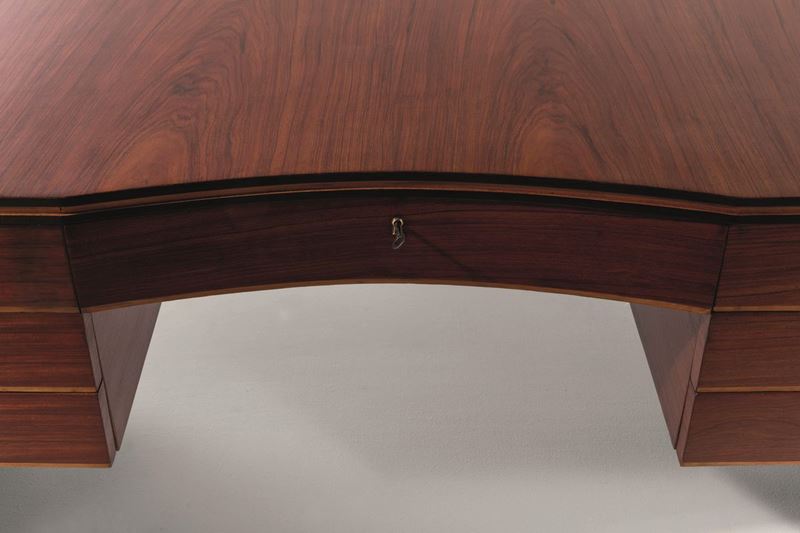 Grande scrivania dirigenziale con struttura in legno e dettagli in metallo.