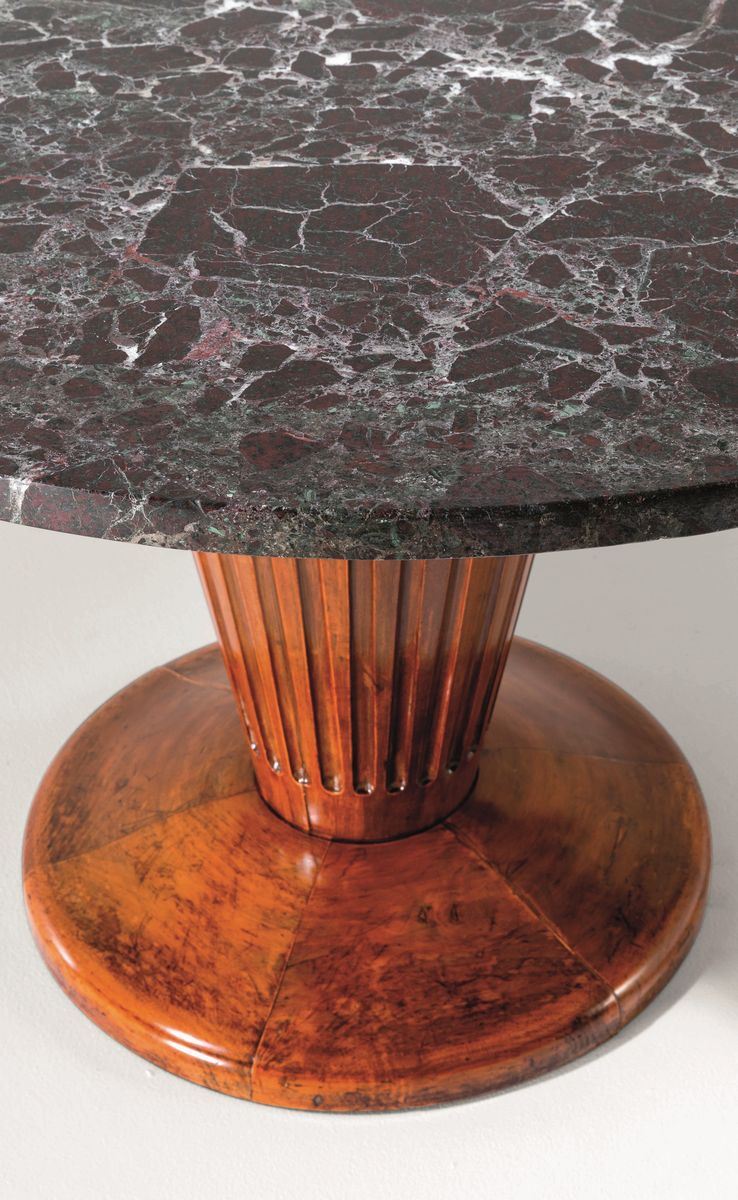 Tavolo con sostegno in legno e piano in marmo di forte spessore.