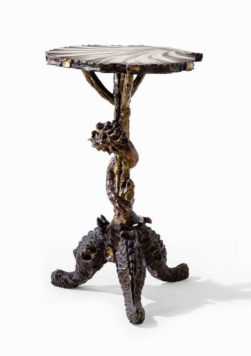 Tavolo d'appoggio in legno dorato e argentato della serie mobili per grotte.