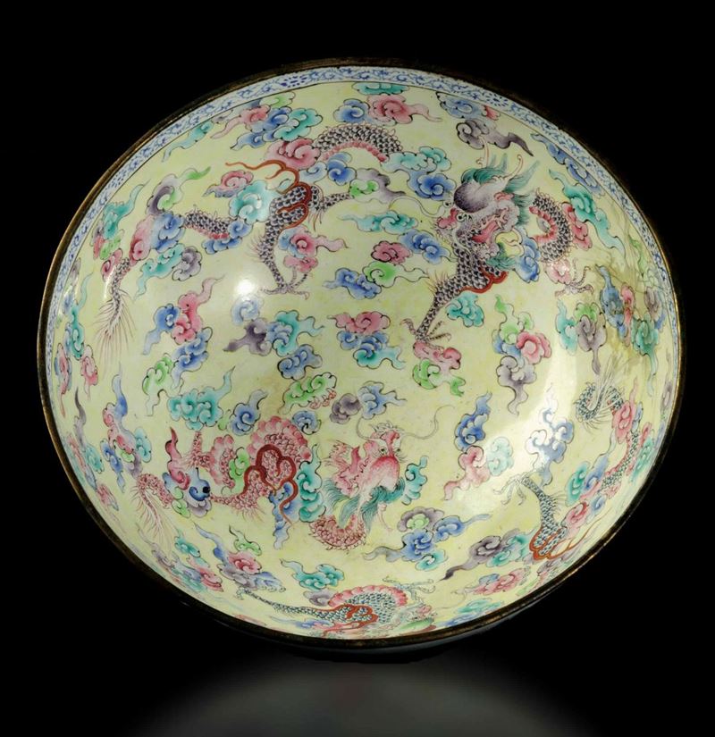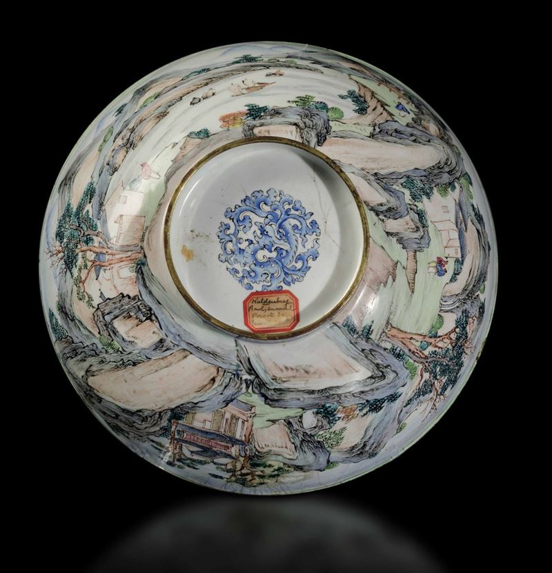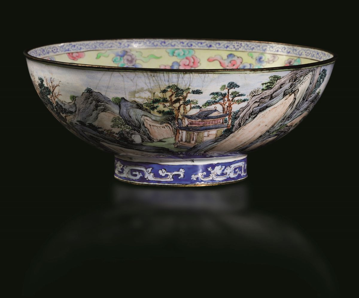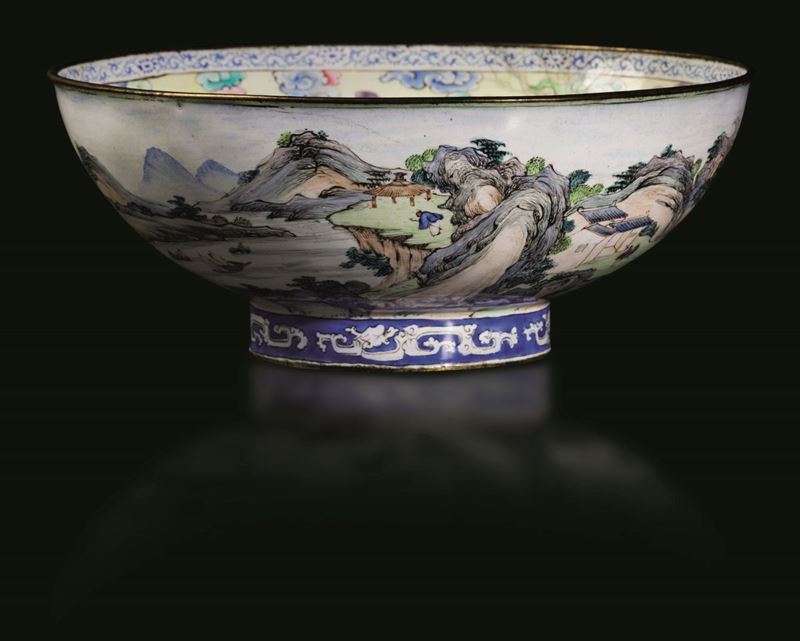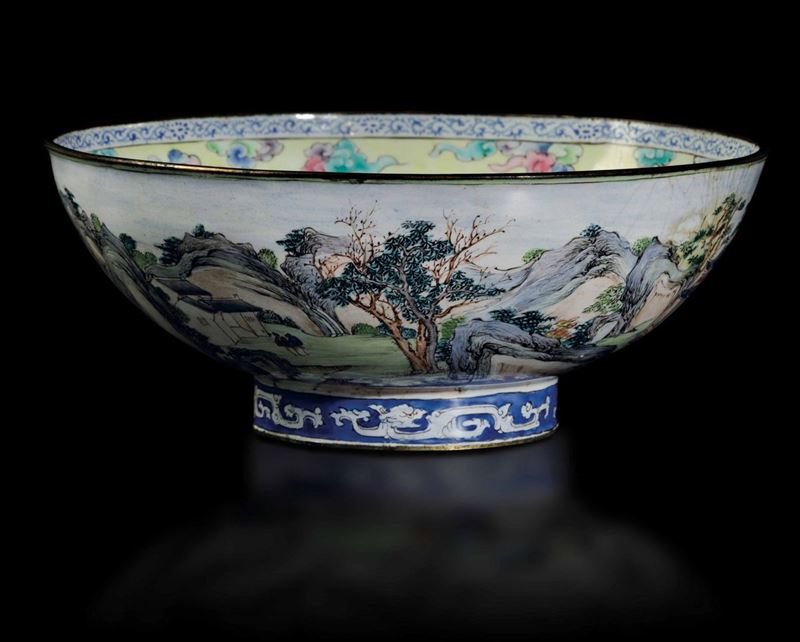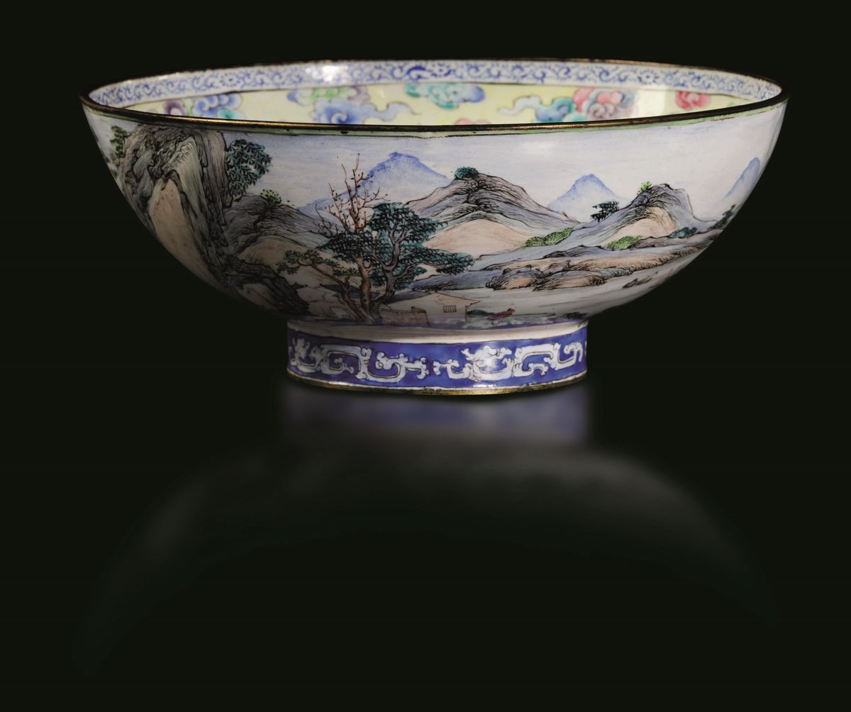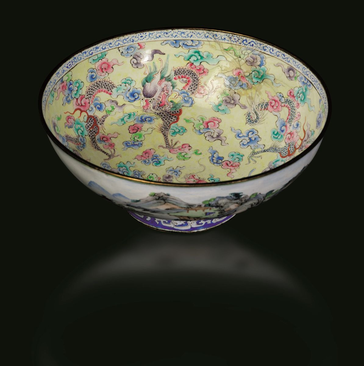 A rare bowl with landscape and decoration of dragons in the clouds, Yongzheng period (1723-1735). 7.5x18.5cm