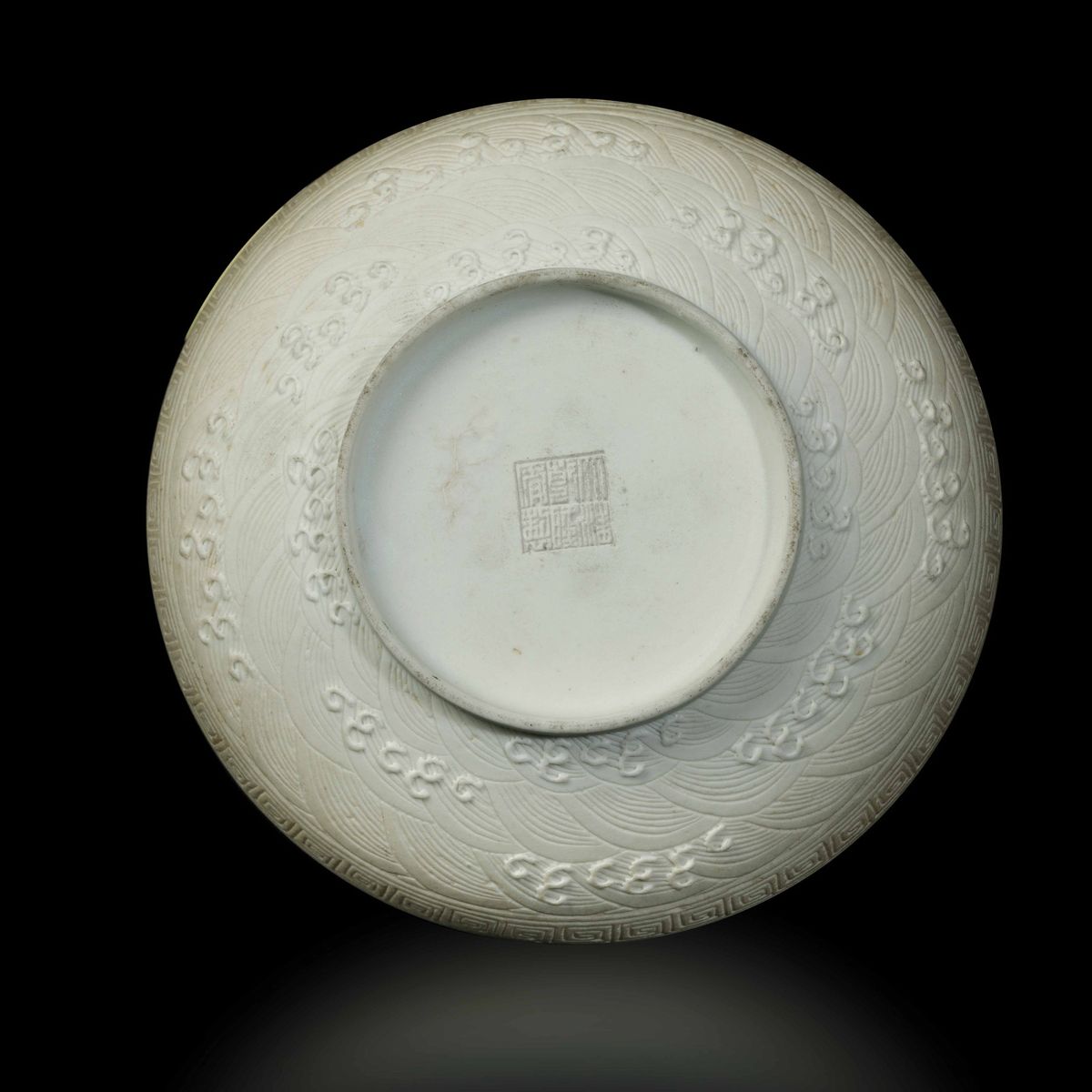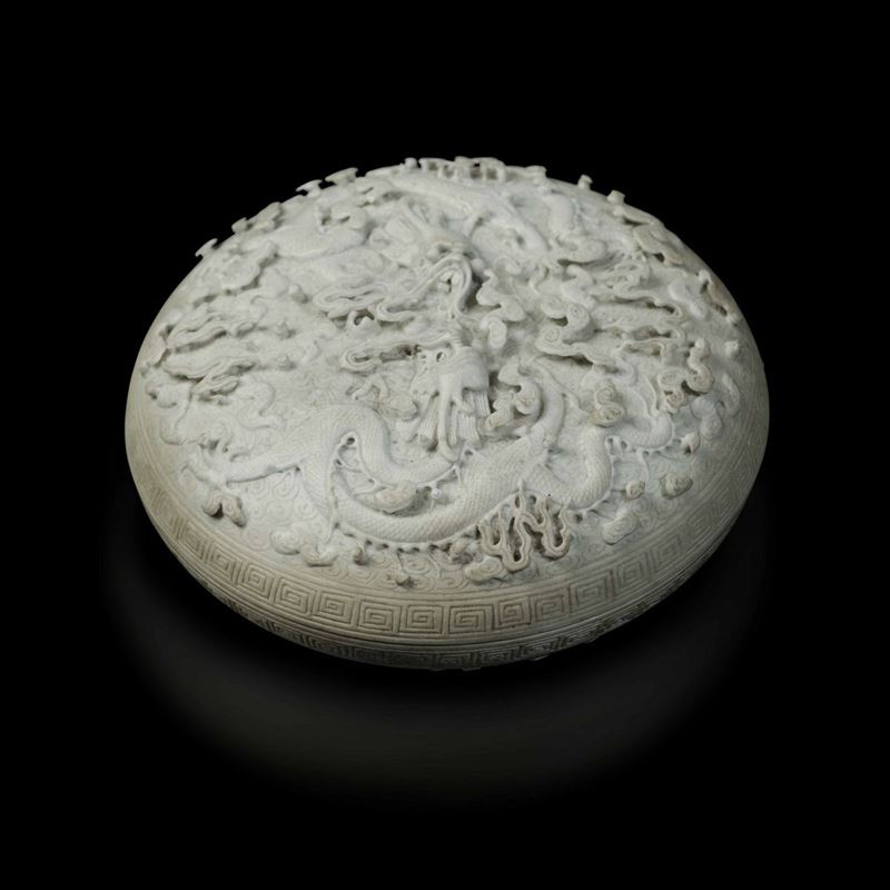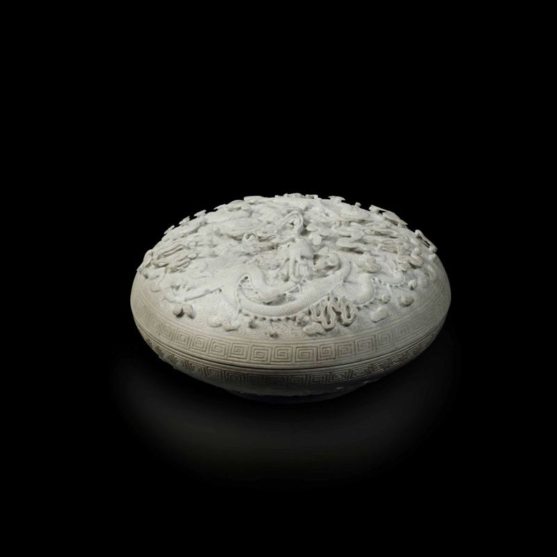 A box with lid in biscuit porcelain with a decoration of dragons in clouds. Qianlong apocryphal mark. Diam 12cm