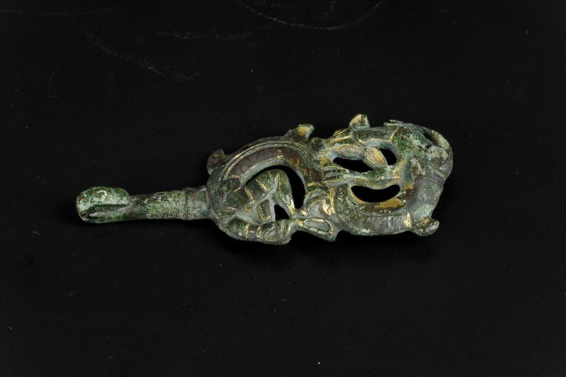 A dragon-shaped, bronze buckle with gilding traces from the Shang Dynasty (1750-1028 b.C.). 11cm.
