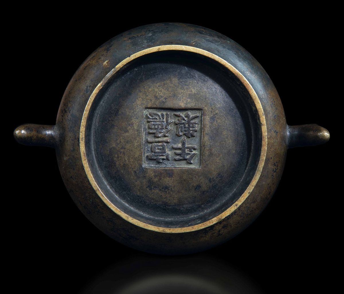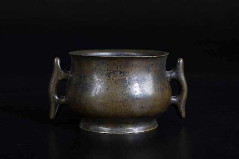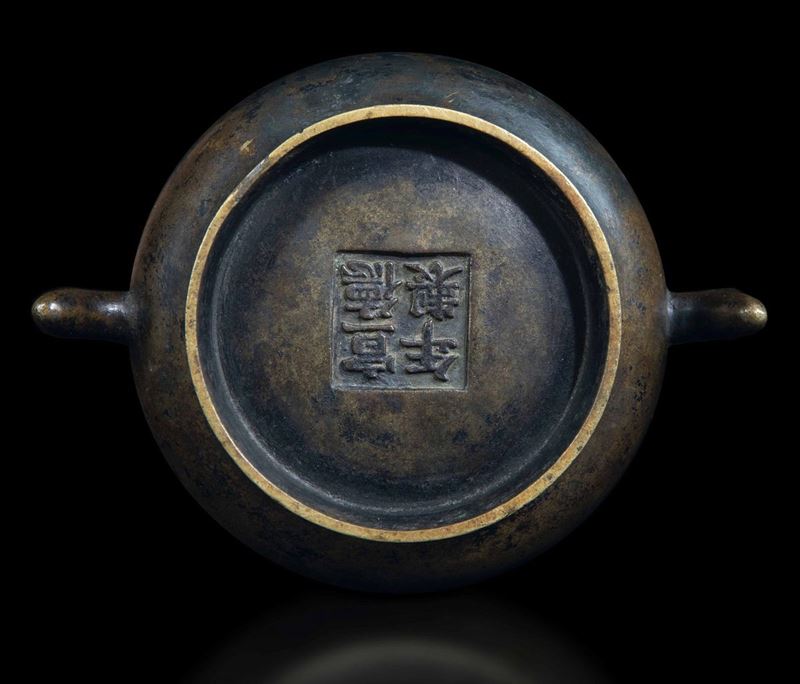 A bronze censer with molded handles, Xuande period (1426-1435). 7.5x13.5x10cm