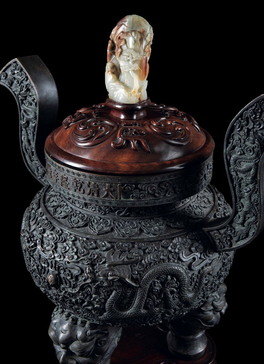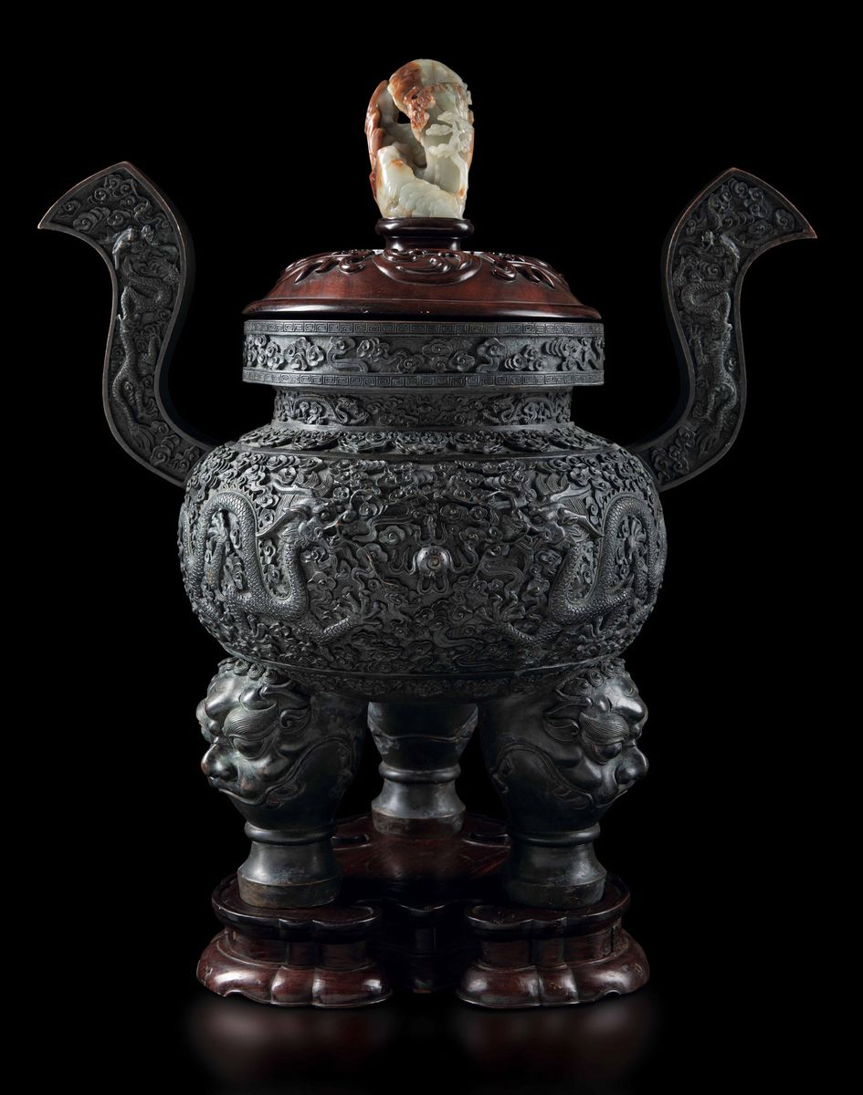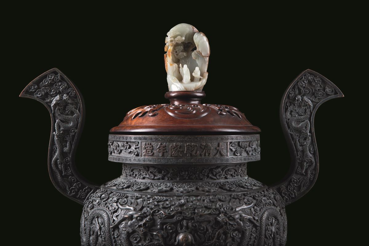 A large and important censer with handles applied, with decoration of dragons in the clouds and a small mountain in jade on the handle of the lid, with mark, Qianlong period (1736-1795). 50x49.5cm