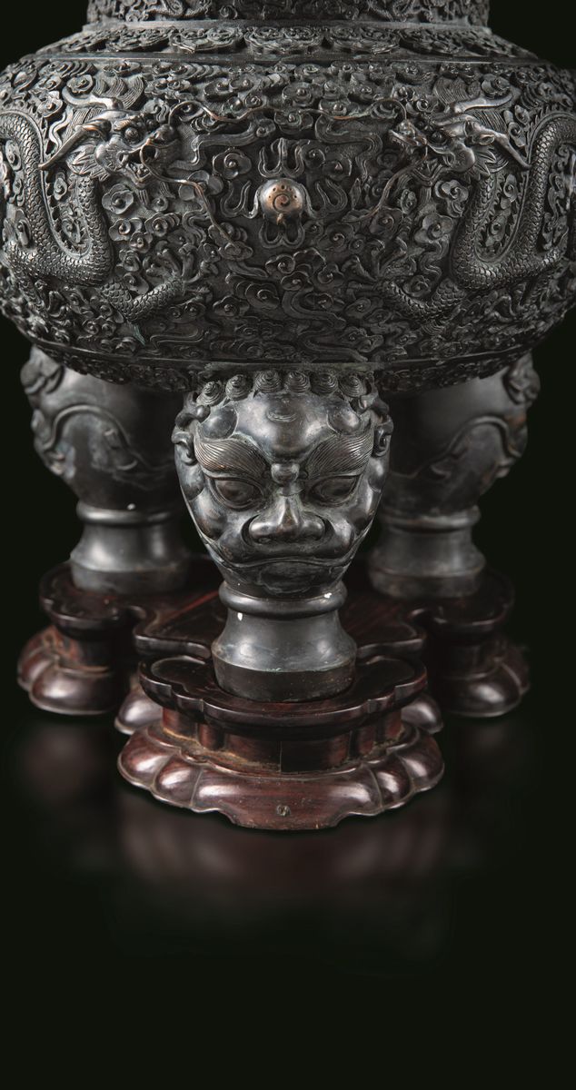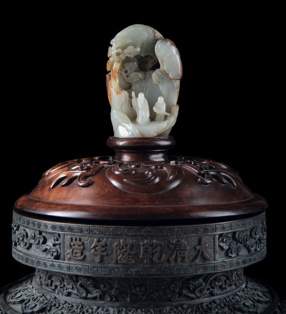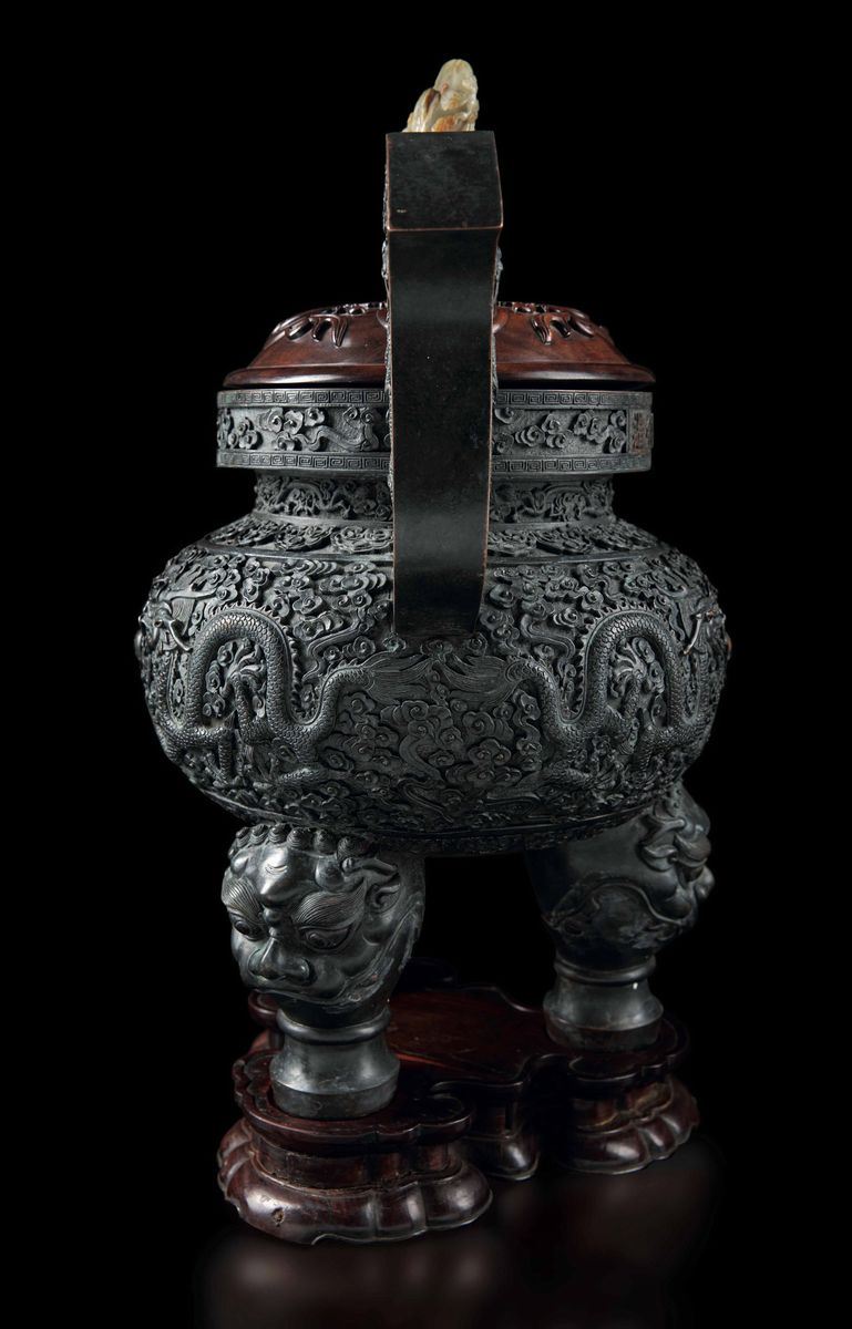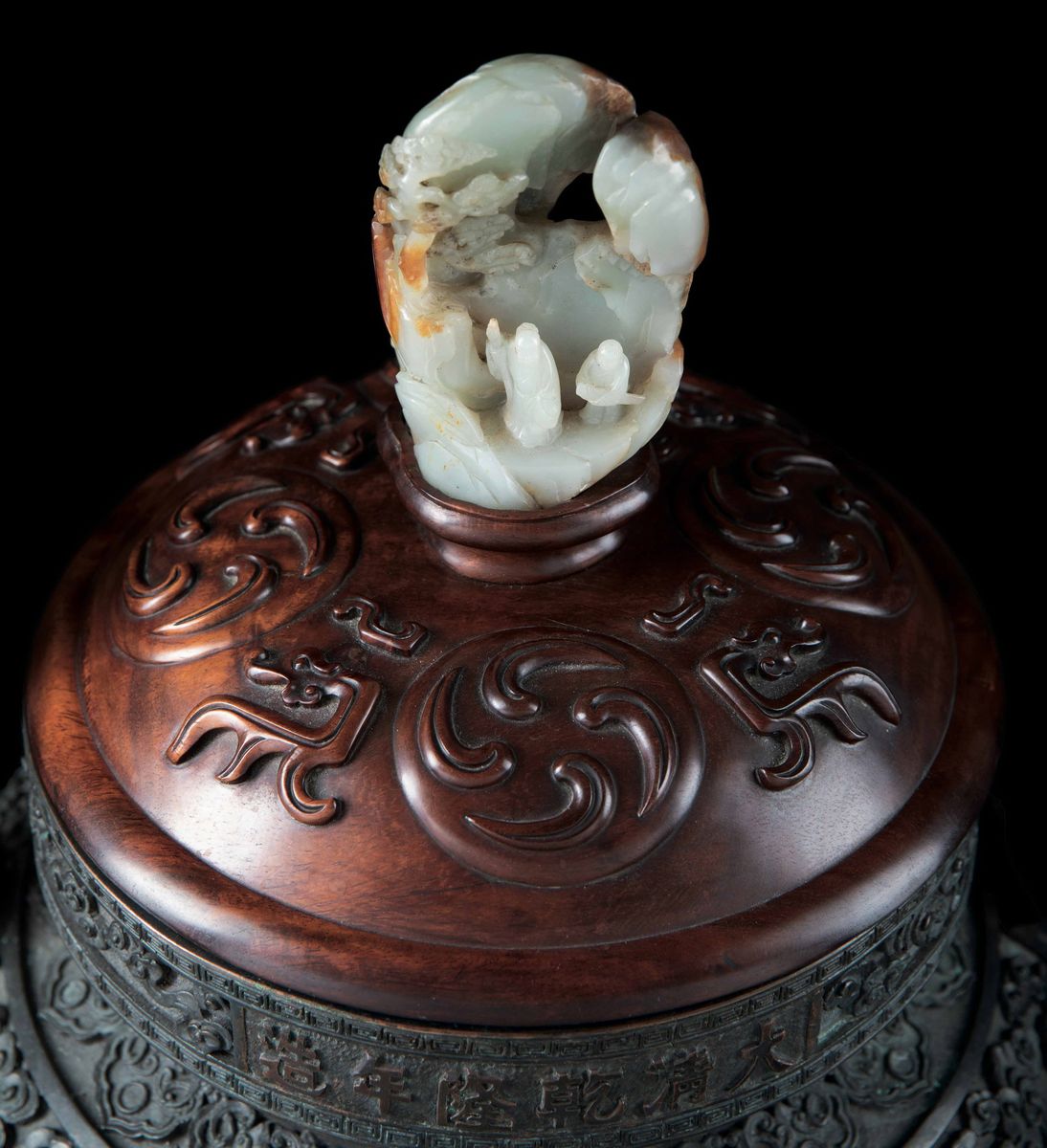A large and important censer with handles applied, with decoration of dragons in the clouds and a small mountain in jade on the handle of the lid, with mark, Qianlong period (1736-1795). 50x49.5cm