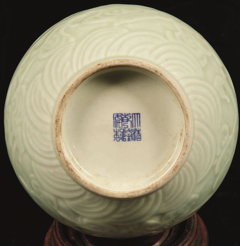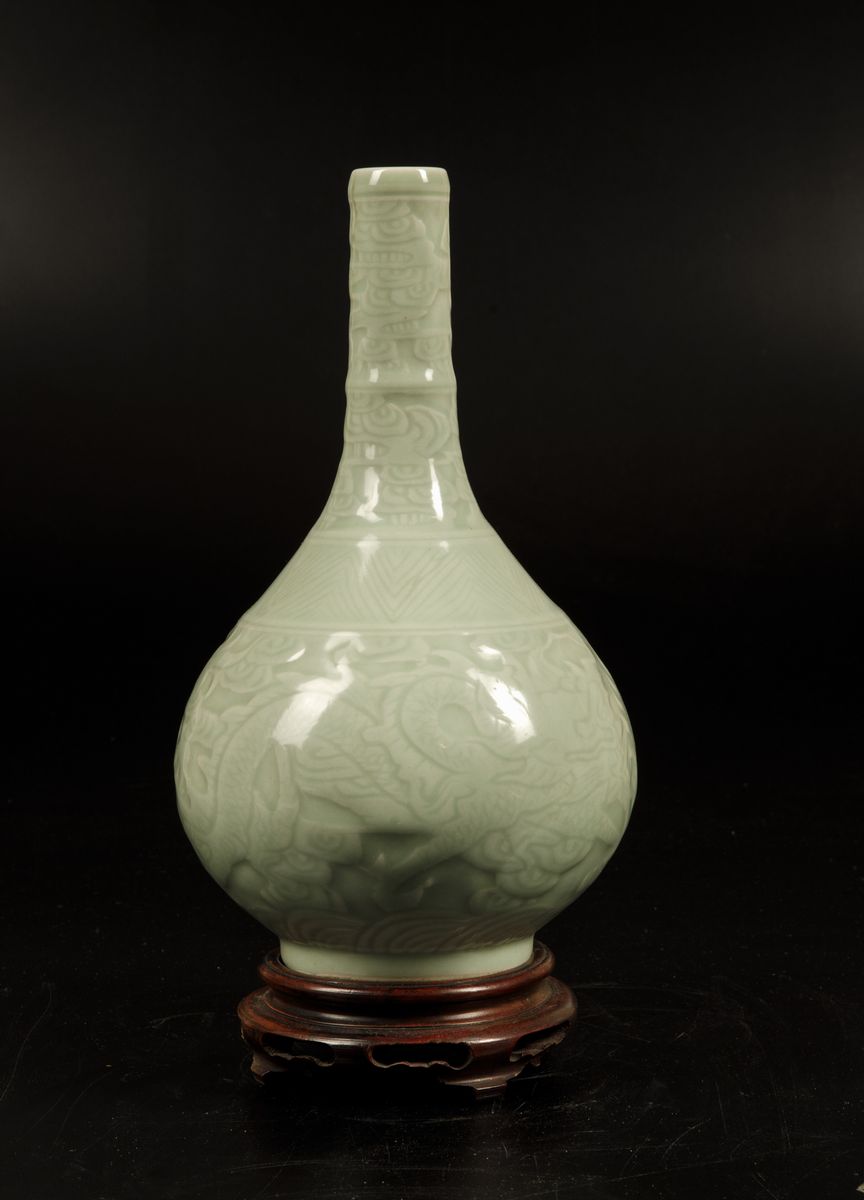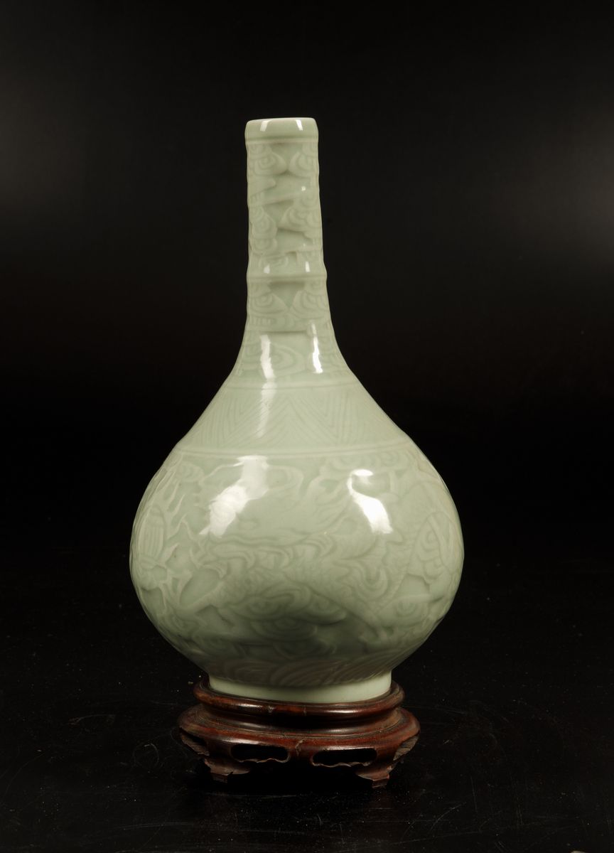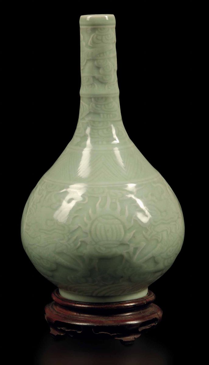 A bottle-shaped vase in Celadon porcelain with decorations of dragons in clouds in relief, Qianlong apocryphal mark. H 27cm