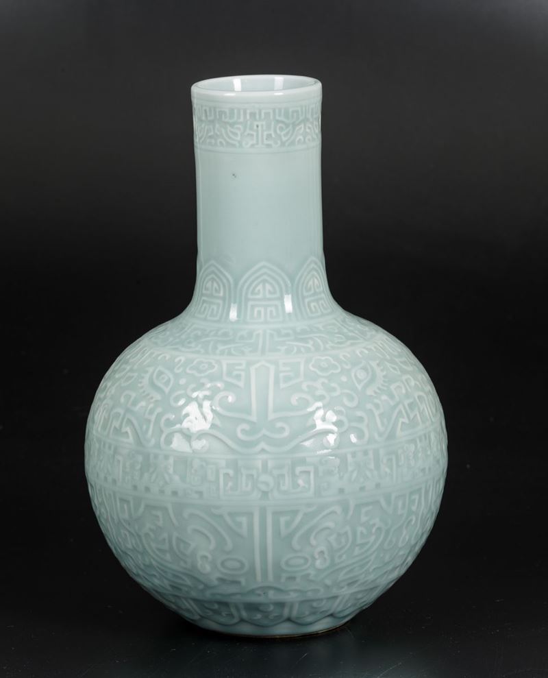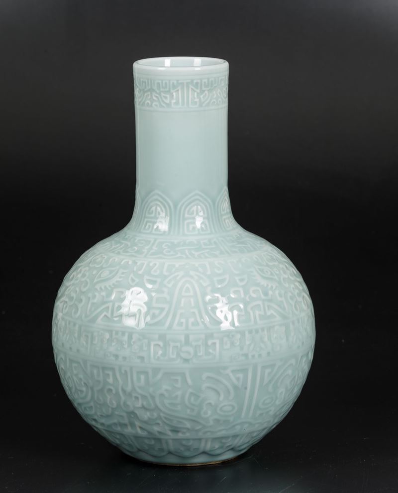 A bottle-shaped vase in Celadon porcelain with archaic decorations and Taotie masks, Qianlong apocryphal mark. H 40cm