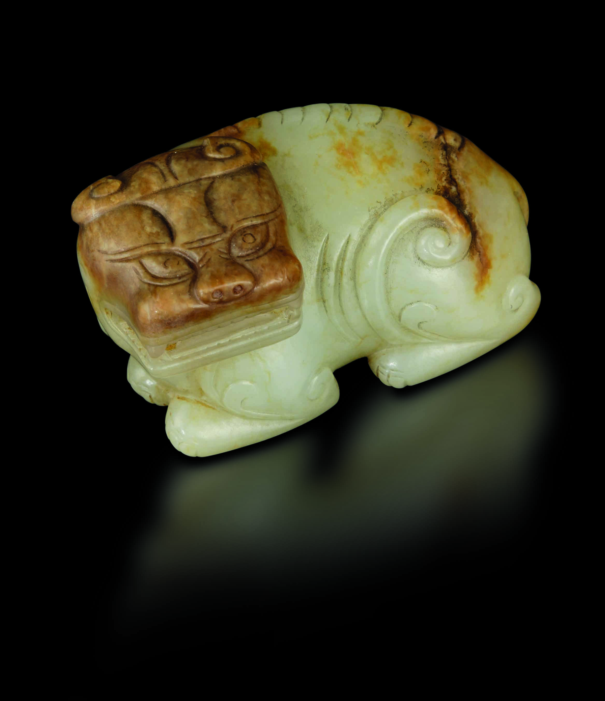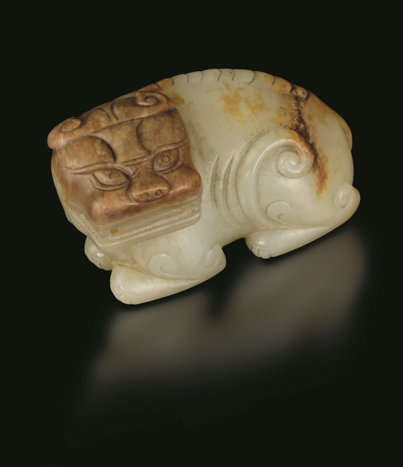 A figure of a dragon carved in white jade and russet. 6x4cm