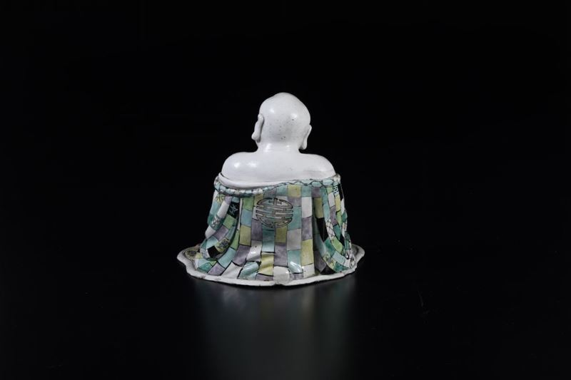 A seated Buddha in polychrome porcelain of the Famille Verte, Kangxi period (1662-1722). H 21cm