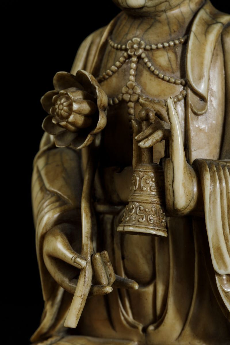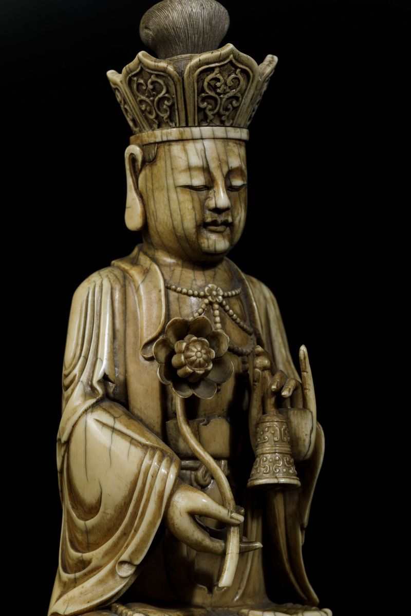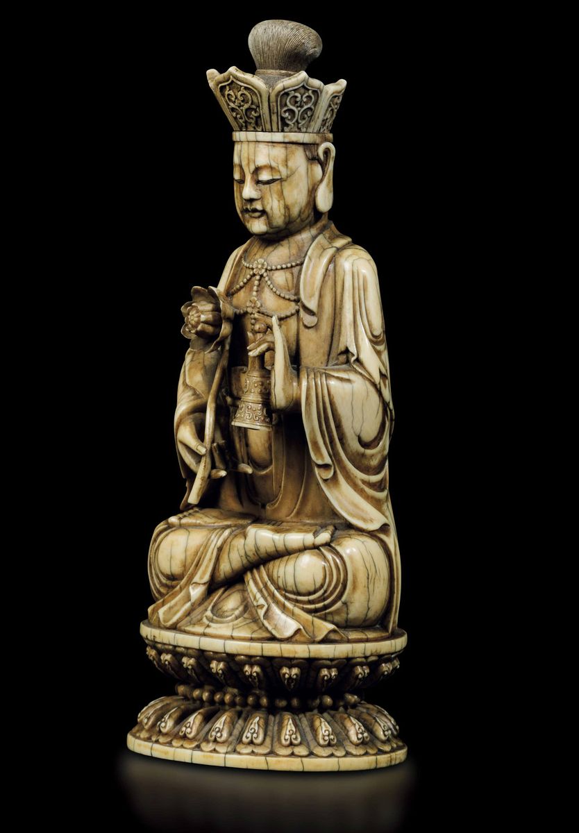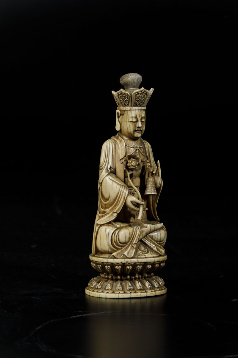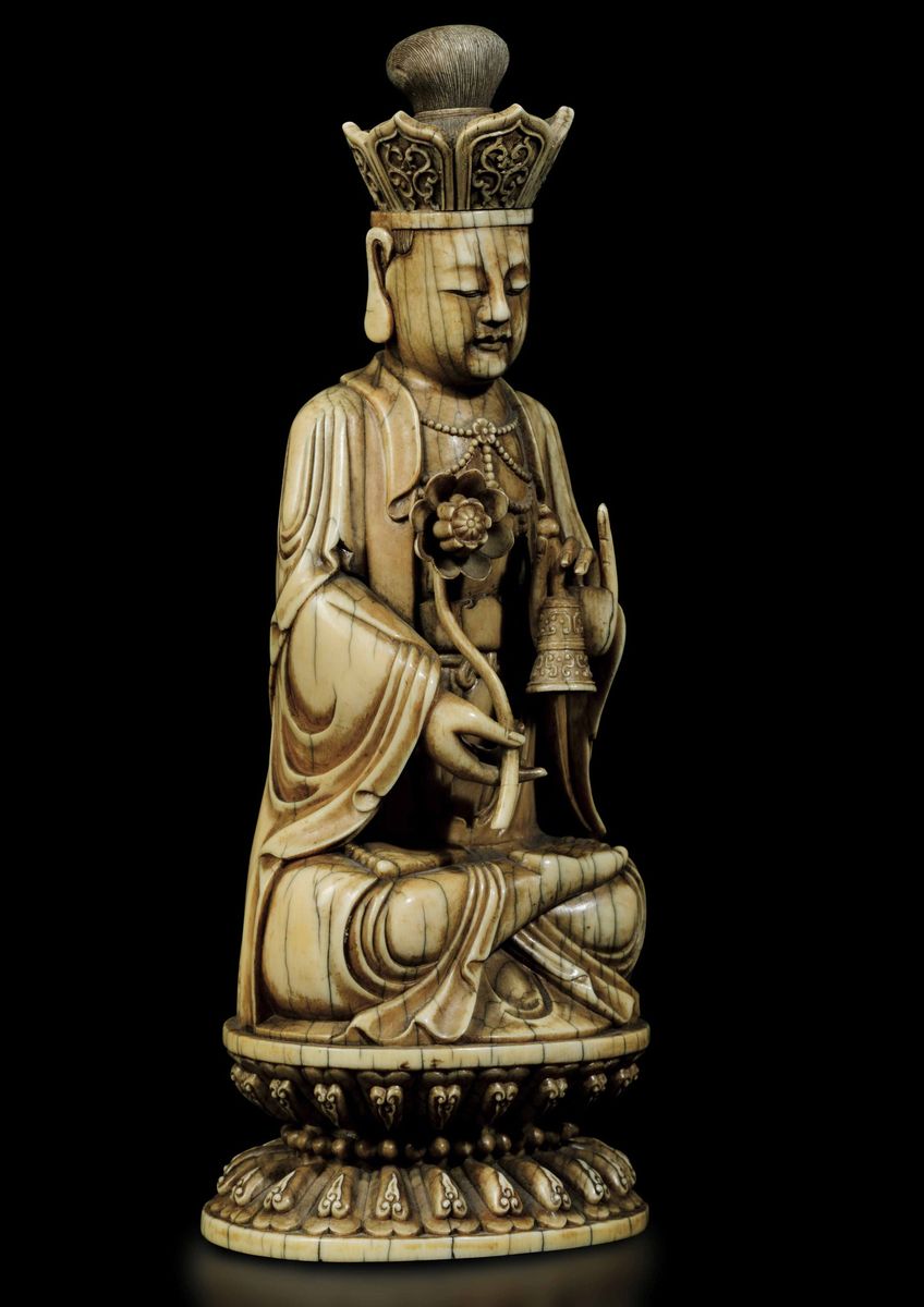 An extraordinaryfigure of a crowned Buddha with flower and ritual bell, seated on double lotus flower, Kangxi period (1662-1722). H 21cm