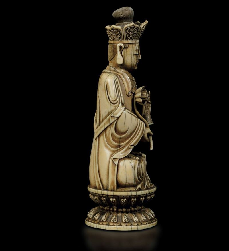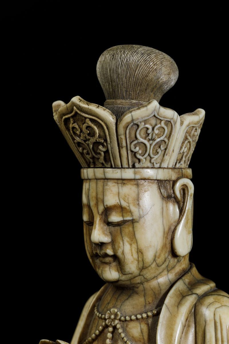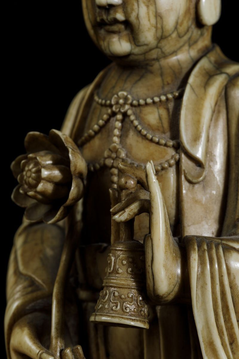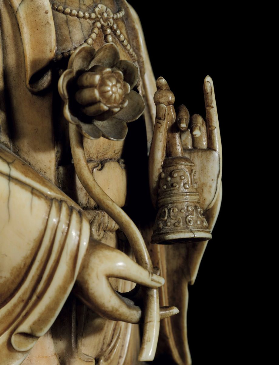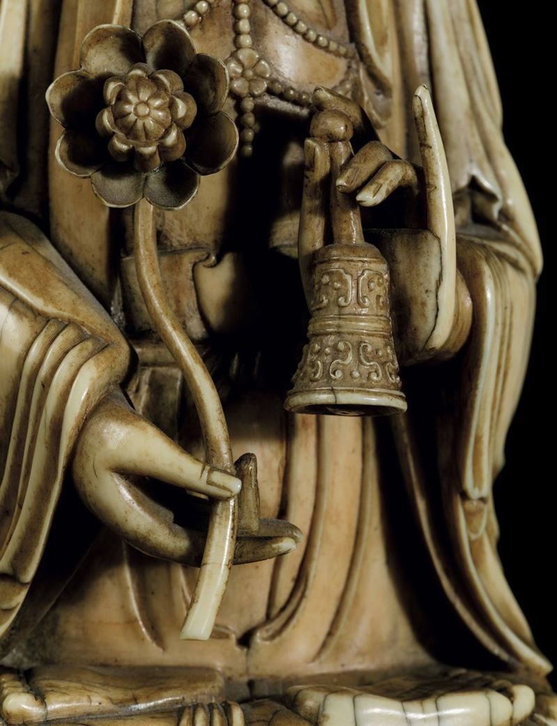 An extraordinaryfigure of a crowned Buddha with flower and ritual bell, seated on double lotus flower, Kangxi period (1662-1722). H 21cm