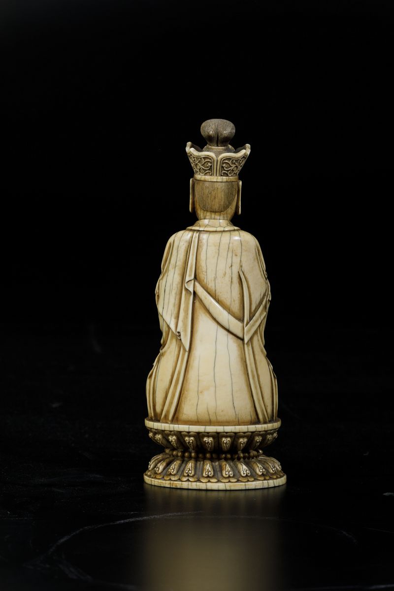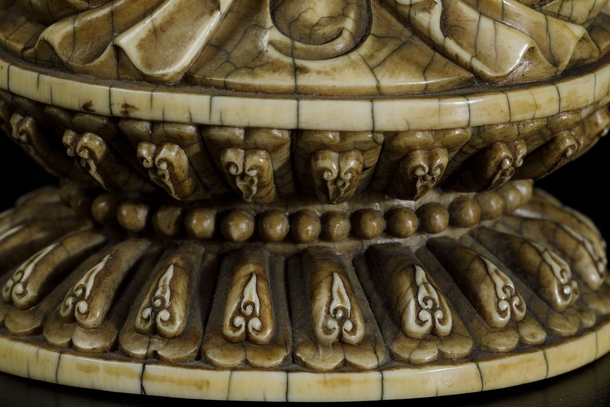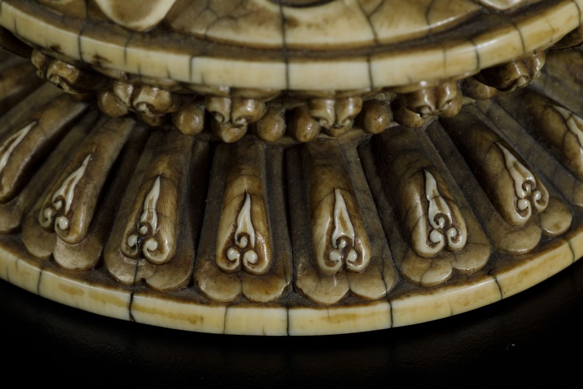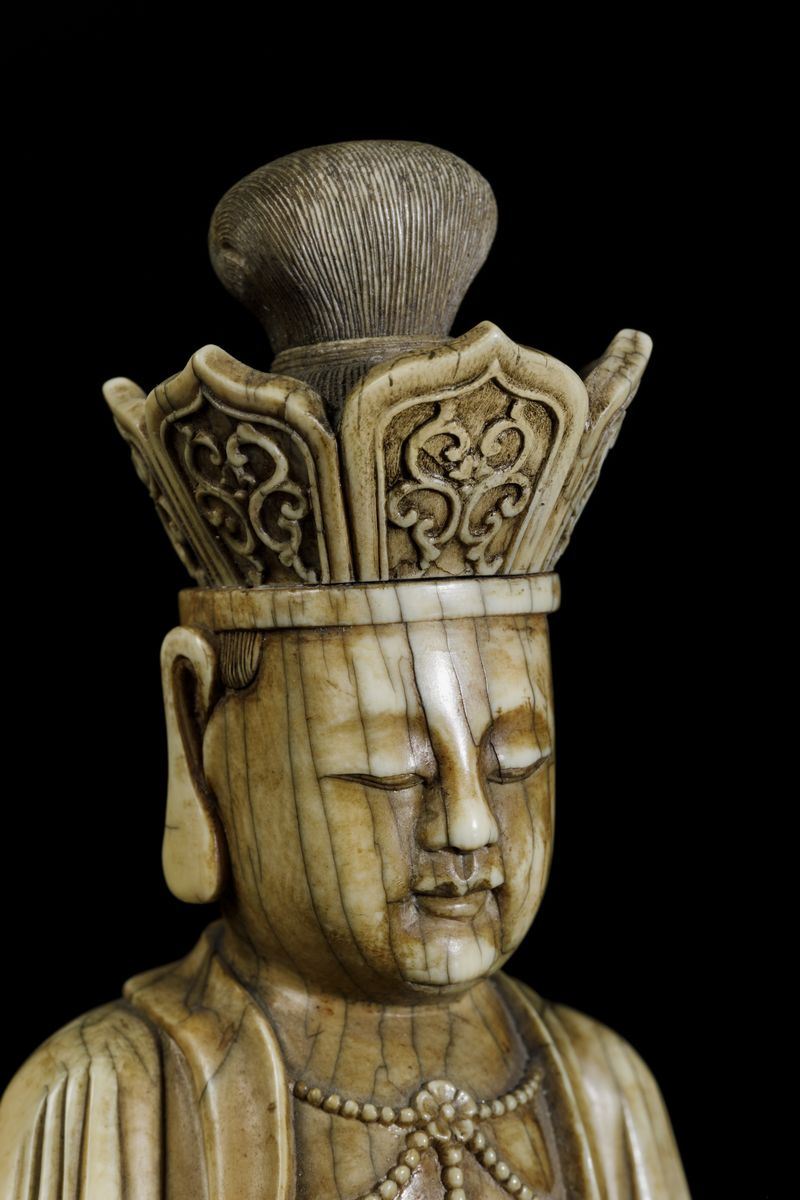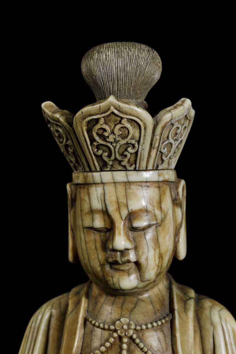 An extraordinaryfigure of a crowned Buddha with flower and ritual bell, seated on double lotus flower, Kangxi period (1662-1722). H 21cm
